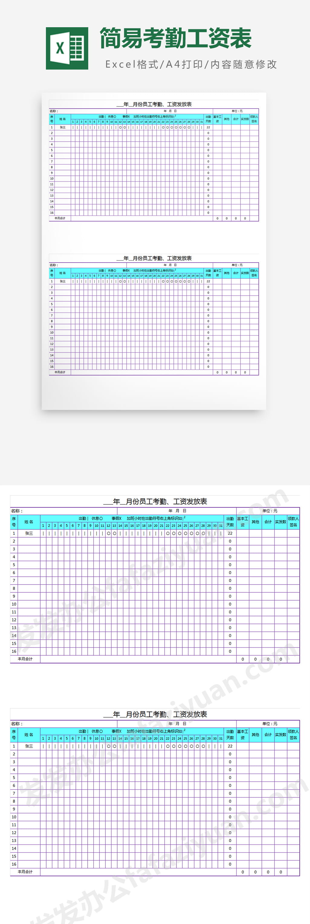 作品内容为简易考勤工资表, 格式为 xlsx, 大小1MB,下载后可直接使用, 请使用软件Excel打开, 作品中主体文字及图片可替换修改,文字修改可直接点击文本框进行编辑,图片更改可选中图片后单击鼠标右键选择更换图片,也可根据自身需求增加和删除作品中的内容, 源文件无水印, 欢迎使用发发资源库。