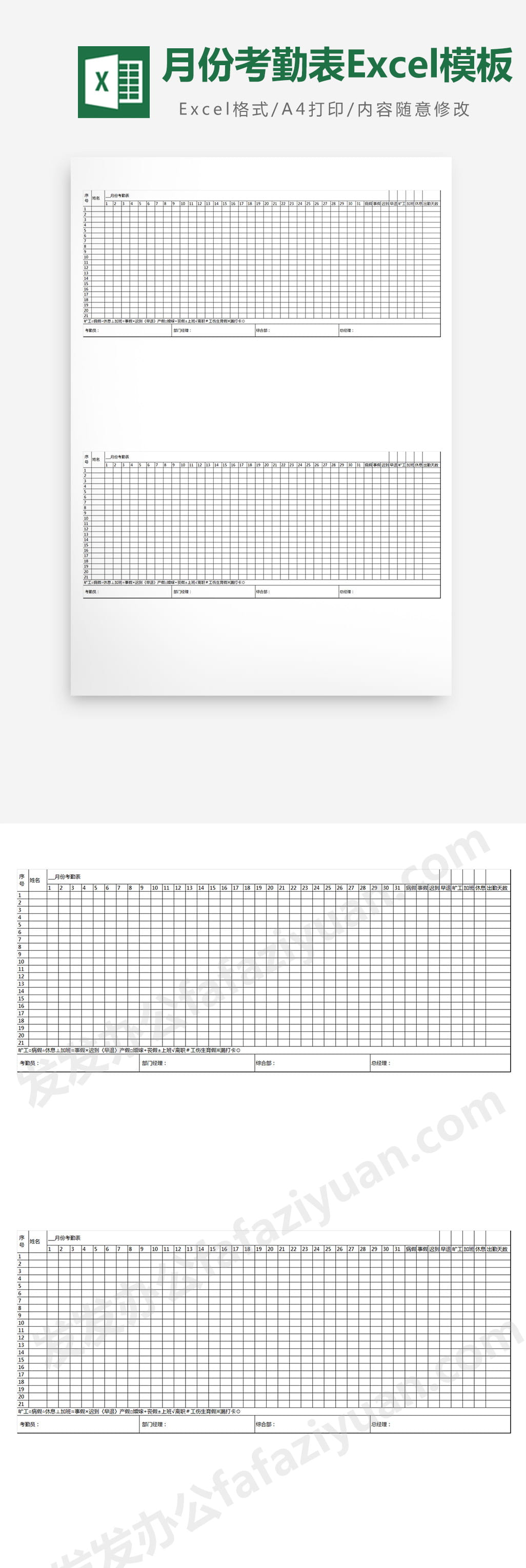 作品内容为月份考勤表Excel模板, 格式为 xlsx, 大小1MB,下载后可直接使用, 请使用软件Excel打开, 作品中主体文字及图片可替换修改,文字修改可直接点击文本框进行编辑,图片更改可选中图片后单击鼠标右键选择更换图片,也可根据自身需求增加和删除作品中的内容, 源文件无水印, 欢迎使用发发资源库。