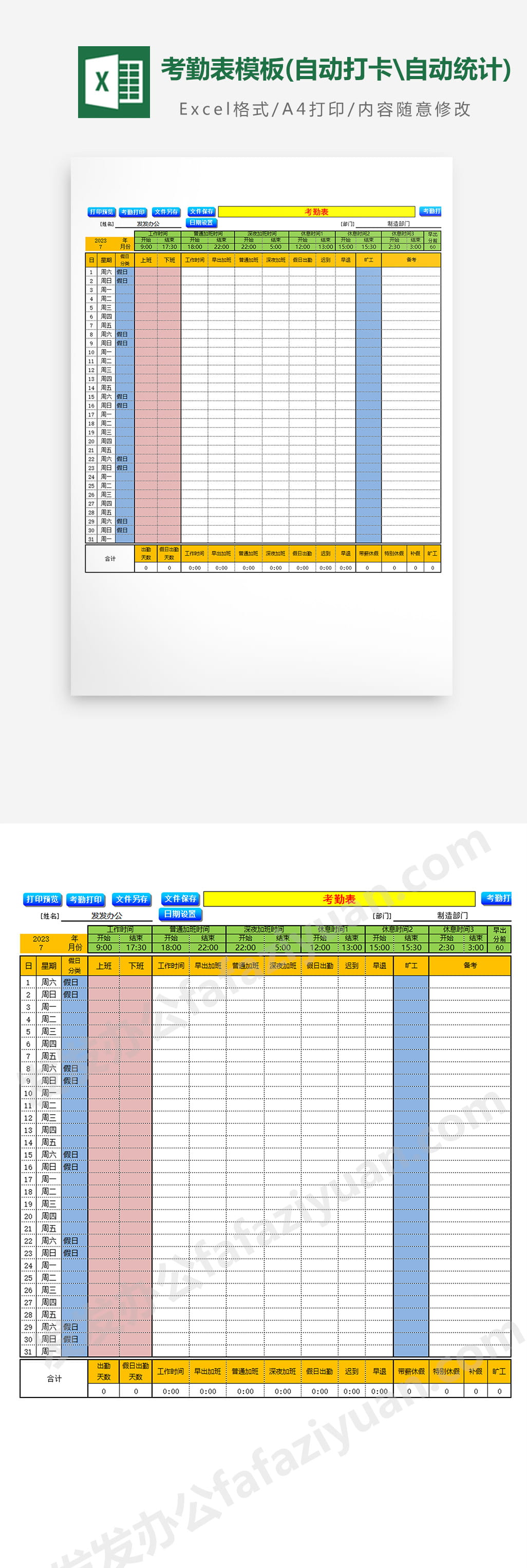 作品内容为考勤表模板(自动打卡,自动统计), 格式为 xlsx, 大小1MB,下载后可直接使用, 请使用软件Excel打开, 作品中主体文字及图片可替换修改,文字修改可直接点击文本框进行编辑,图片更改可选中图片后单击鼠标右键选择更换图片,也可根据自身需求增加和删除作品中的内容, 源文件无水印, 欢迎使用发发资源库。 资源下载此资源下载价格为8.8F币,VIP免费,请先登录