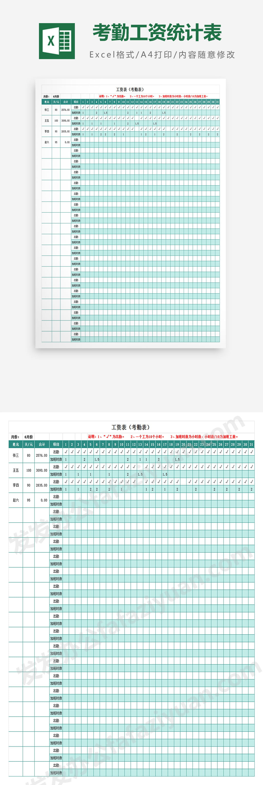 作品内容为考勤工资统计表, 格式为 xlsx, 大小1MB,下载后可直接使用, 请使用软件Excel打开, 作品中主体文字及图片可替换修改,文字修改可直接点击文本框进行编辑,图片更改可选中图片后单击鼠标右键选择更换图片,也可根据自身需求增加和删除作品中的内容, 源文件无水印, 欢迎使用发发资源库。