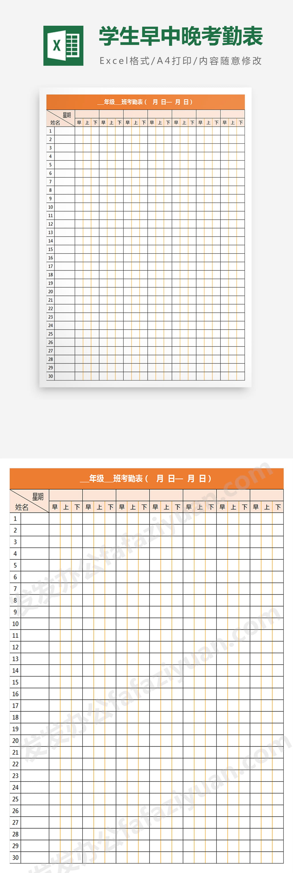 作品内容为学生早中晚考勤表, 格式为 xlsx, 大小1MB,下载后可直接使用, 请使用软件Excel打开, 作品中主体文字及图片可替换修改,文字修改可直接点击文本框进行编辑,图片更改可选中图片后单击鼠标右键选择更换图片,也可根据自身需求增加和删除作品中的内容, 源文件无水印, 欢迎使用发发资源库。