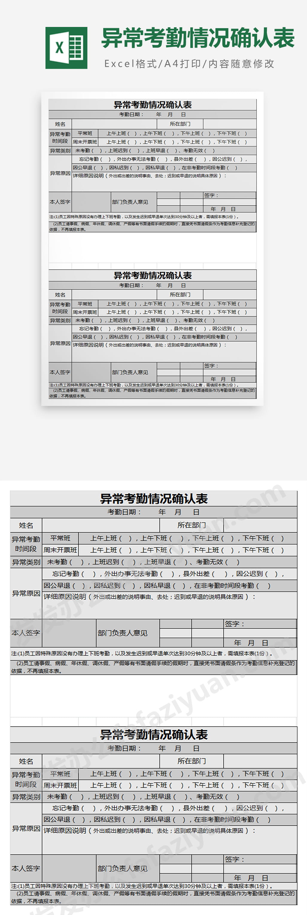 作品内容为异常考勤情况确认表, 格式为 xlsx, 大小1MB,下载后可直接使用, 请使用软件Excel打开, 作品中主体文字及图片可替换修改,文字修改可直接点击文本框进行编辑,图片更改可选中图片后单击鼠标右键选择更换图片,也可根据自身需求增加和删除作品中的内容, 源文件无水印, 欢迎使用发发资源库。 资源下载此资源下载价格为8.8F币,VIP免费,请先登录