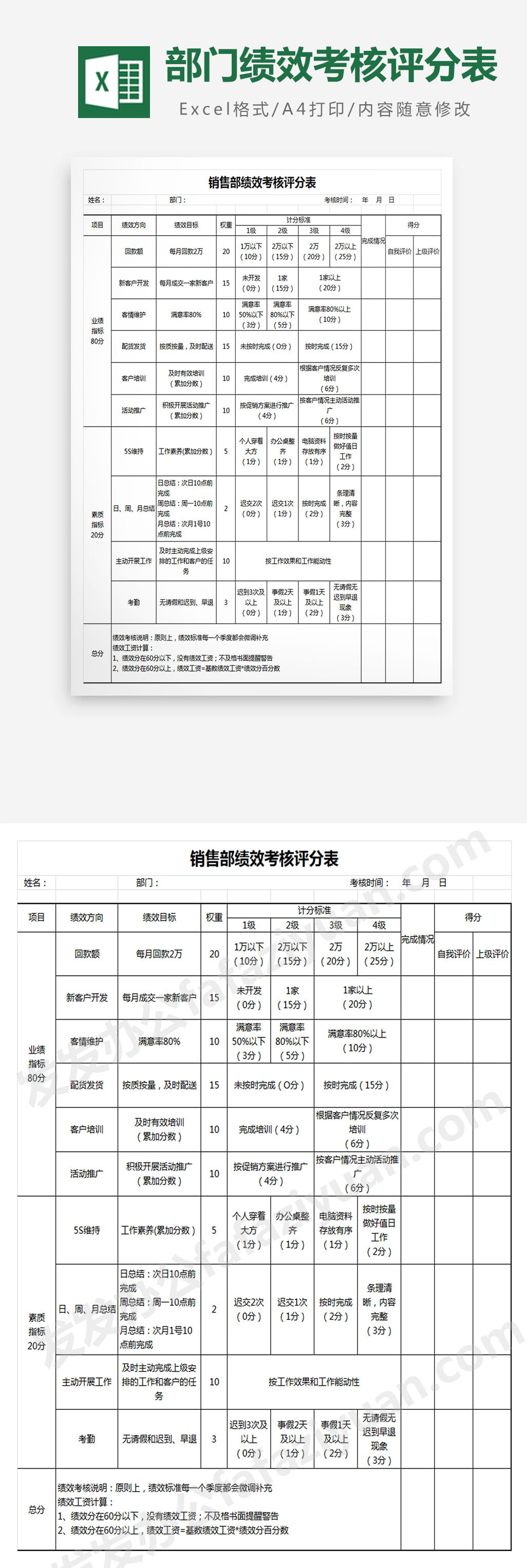 作品内容为部门绩效考核评分表, 格式为 xlsx, 大小1MB,下载后可直接使用, 请使用软件Excel打开, 作品中主体文字及图片可替换修改,文字修改可直接点击文本框进行编辑,图片更改可选中图片后单击鼠标右键选择更换图片,也可根据自身需求增加和删除作品中的内容, 源文件无水印, 欢迎使用发发资源库。 资源下载此资源下载价格为8.8F币,VIP免费,请先登录