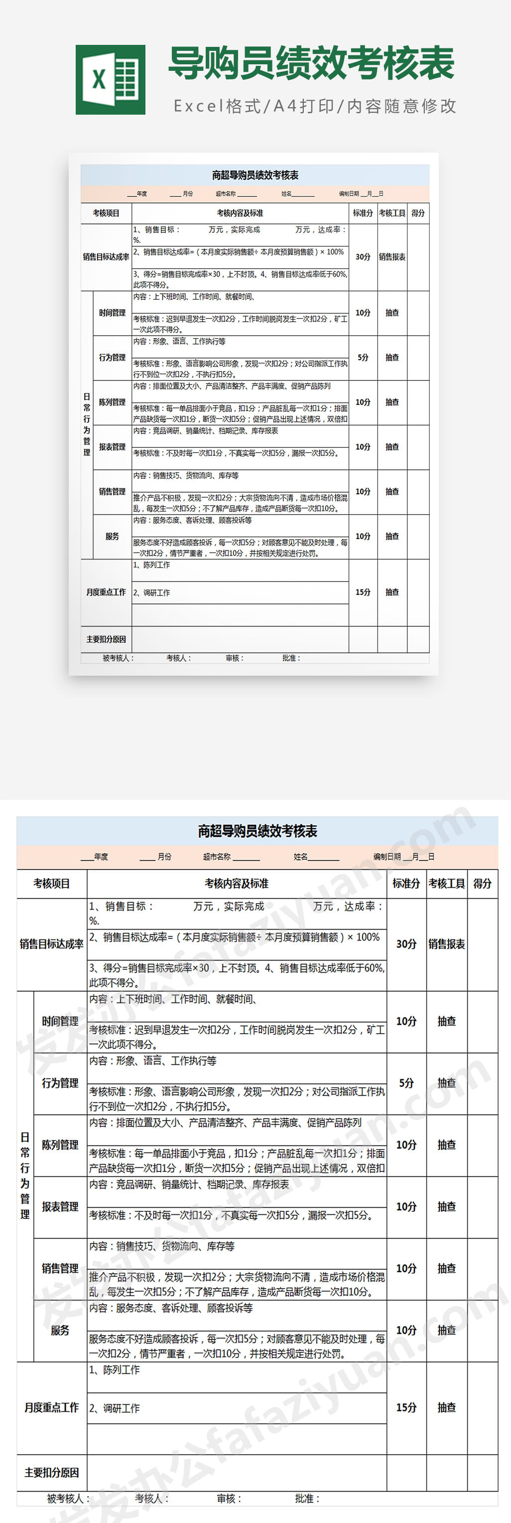 作品内容为导购员绩效考核表, 格式为 xlsx, 大小1MB,下载后可直接使用, 请使用软件Excel打开, 作品中主体文字及图片可替换修改,文字修改可直接点击文本框进行编辑,图片更改可选中图片后单击鼠标右键选择更换图片,也可根据自身需求增加和删除作品中的内容, 源文件无水印, 欢迎使用发发资源库。