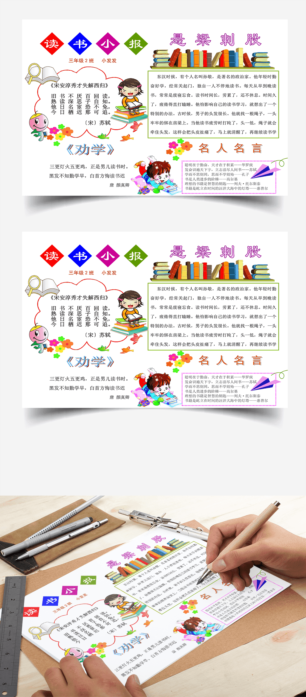 - 卡通书籍读书电子小报悬梁刺骨手抄报word模板 2022-05-07