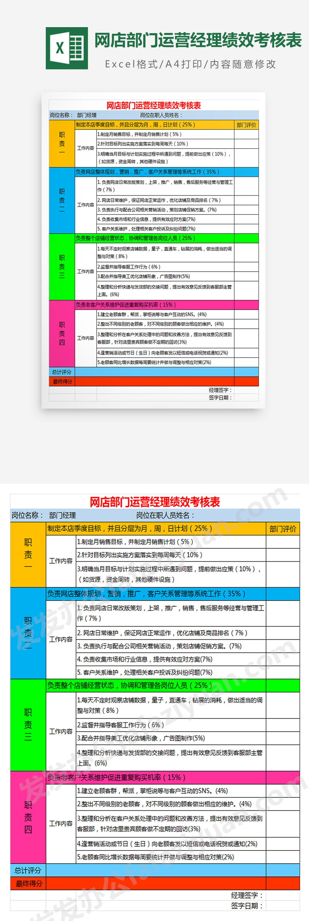 作品内容为网店部门运营经理绩效考核表, 格式为 xlsx, 大小1MB,下载后可直接使用, 请使用软件Excel打开, 作品中主体文字及图片可替换修改,文字修改可直接点击文本框进行编辑,图片更改可选中图片后单击鼠标右键选择更换图片,也可根据自身需求增加和删除作品中的内容, 源文件无水印, 欢迎使用发发资源库。