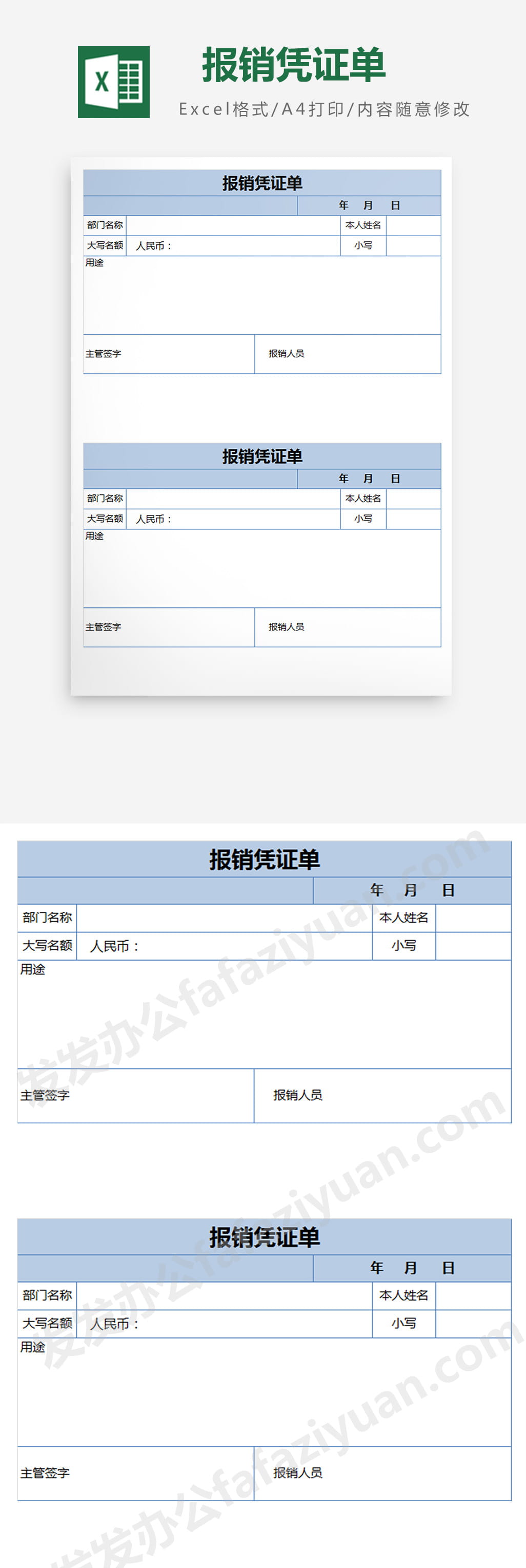 作品内容为报销凭证单Excel表格, 格式为 xlsx, 大小1MB,下载后可直接使用, 请使用软件Excel打开, 作品中主体文字及图片可替换修改,文字修改可直接点击文本框进行编辑,图片更改可选中图片后单击鼠标右键选择更换图片,也可根据自身需求增加和删除作品中的内容, 源文件无水印, 欢迎使用发发资源库。