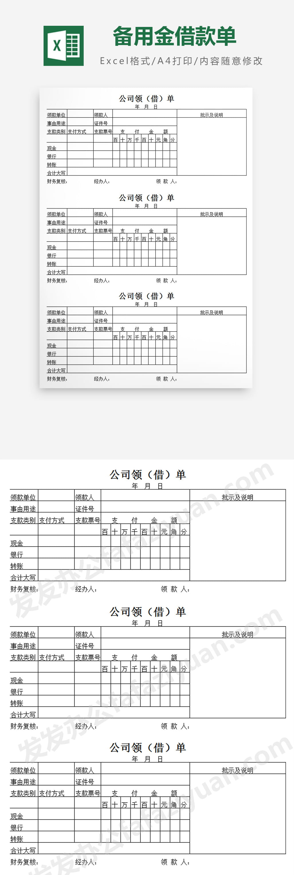 作品内容为备用金借款单Excel表格, 格式为 xlsx, 大小1MB,下载后可直接使用, 请使用软件Excel打开, 作品中主体文字及图片可替换修改,文字修改可直接点击文本框进行编辑,图片更改可选中图片后单击鼠标右键选择更换图片,也可根据自身需求增加和删除作品中的内容, 源文件无水印, 欢迎使用发发资源库。 资源下载此资源下载价格为8.8F币,VIP免费,请先登录