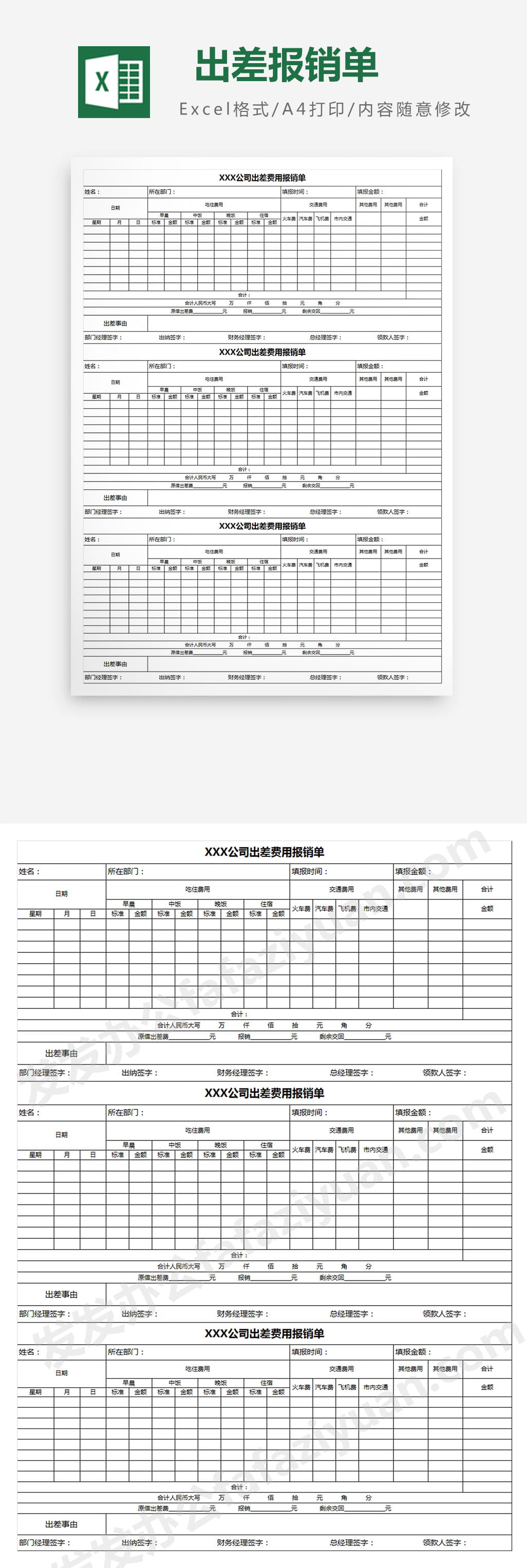 作品内容为出差报销单, 格式为 xlsx, 大小1MB,下载后可直接使用, 请使用软件Excel打开, 作品中主体文字及图片可替换修改,文字修改可直接点击文本框进行编辑,图片更改可选中图片后单击鼠标右键选择更换图片,也可根据自身需求增加和删除作品中的内容, 源文件无水印, 欢迎使用发发资源库。