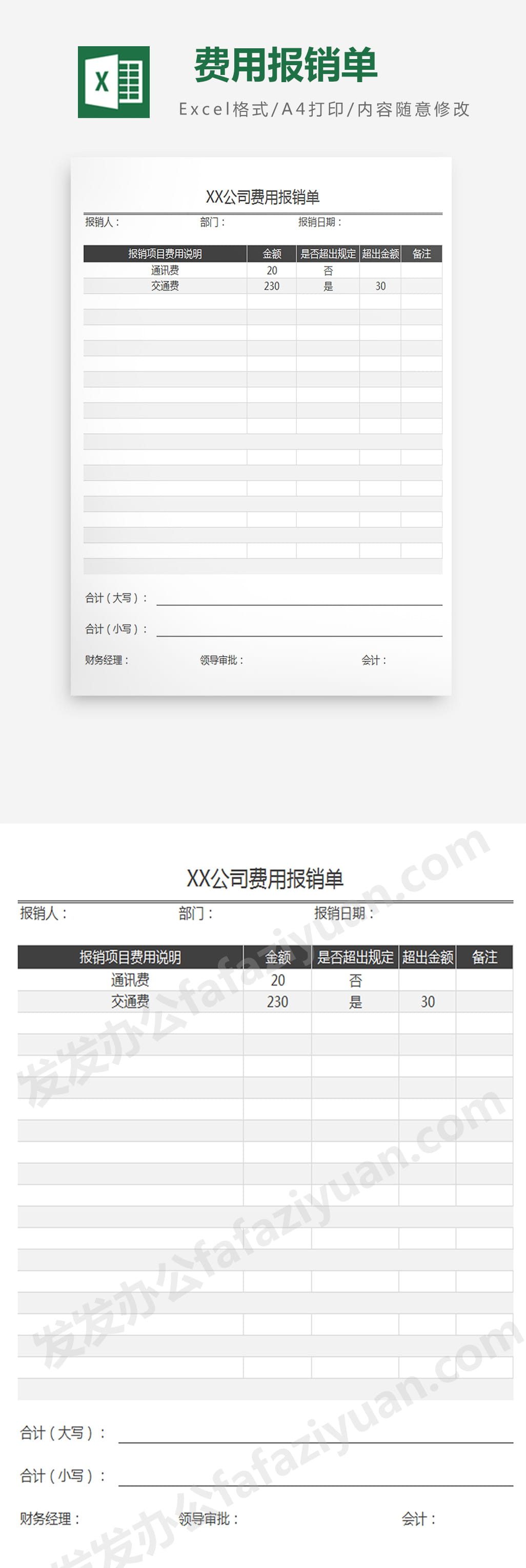 作品内容为费用报销单Excel表格, 格式为 xlsx, 大小1MB,下载后可直接使用, 请使用软件Excel打开, 作品中主体文字及图片可替换修改,文字修改可直接点击文本框进行编辑,图片更改可选中图片后单击鼠标右键选择更换图片,也可根据自身需求增加和删除作品中的内容, 源文件无水印, 欢迎使用发发资源库。