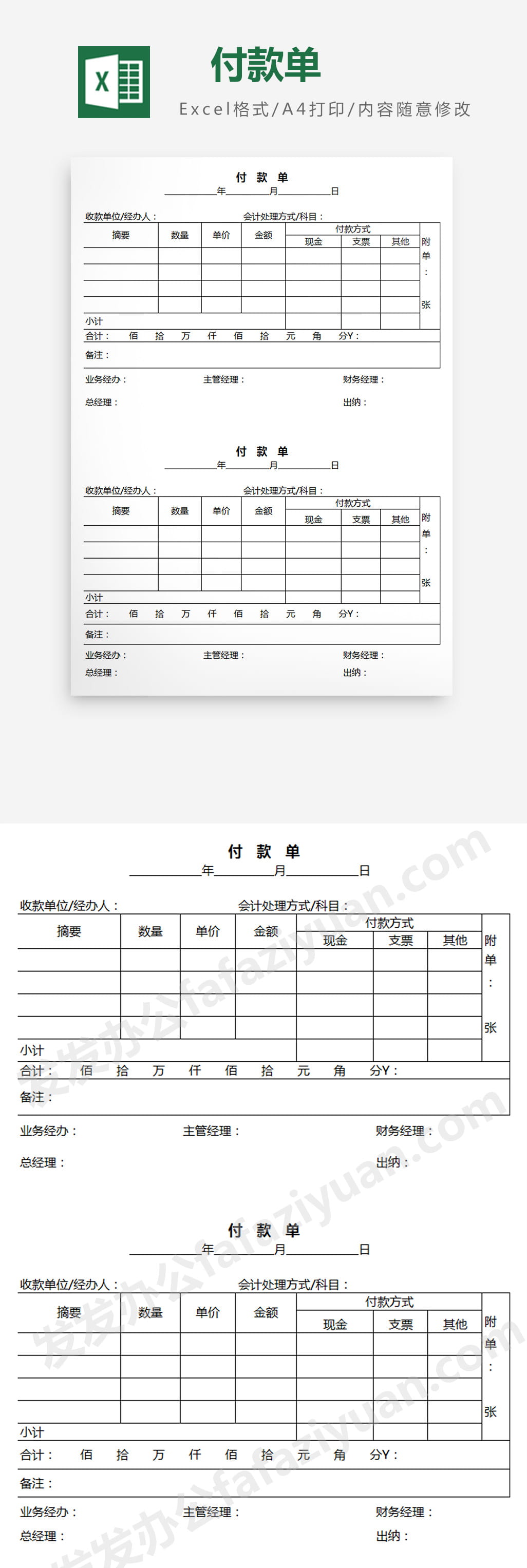 作品内容为付款单Excel表格, 格式为 xlsx, 大小1MB,下载后可直接使用, 请使用软件Excel打开, 作品中主体文字及图片可替换修改,文字修改可直接点击文本框进行编辑,图片更改可选中图片后单击鼠标右键选择更换图片,也可根据自身需求增加和删除作品中的内容, 源文件无水印, 欢迎使用发发资源库。