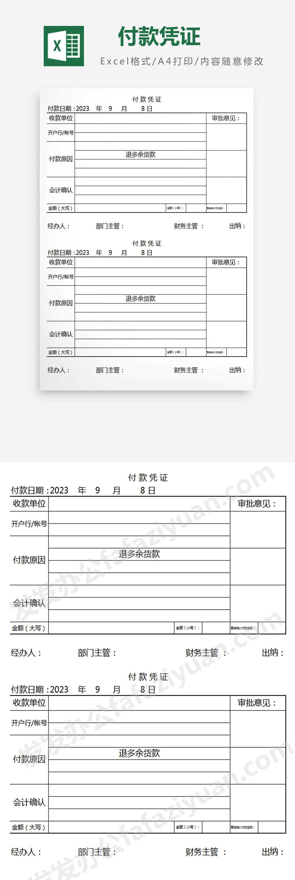 作品内容为付款凭证Excel表格, 格式为 xlsx, 大小1MB,下载后可直接使用, 请使用软件Excel打开, 作品中主体文字及图片可替换修改,文字修改可直接点击文本框进行编辑,图片更改可选中图片后单击鼠标右键选择更换图片,也可根据自身需求增加和删除作品中的内容, 源文件无水印, 欢迎使用发发资源库。