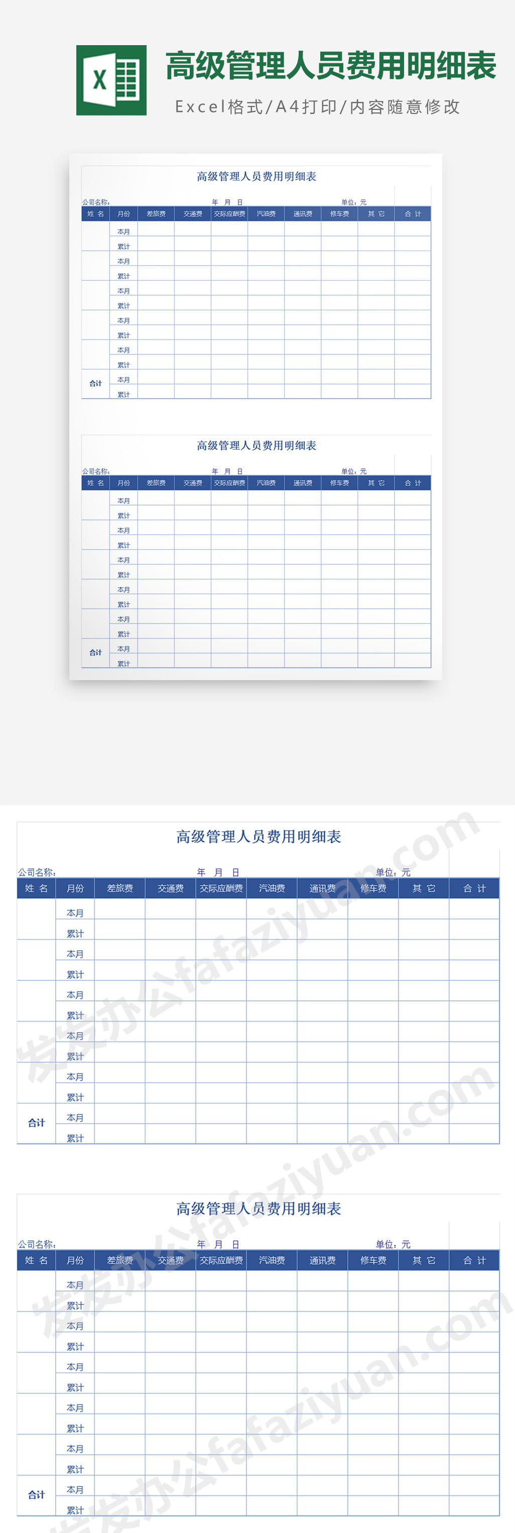 作品内容为高级管理人员费用明细表, 格式为 xlsx, 大小1MB,下载后可直接使用, 请使用软件Excel打开, 作品中主体文字及图片可替换修改,文字修改可直接点击文本框进行编辑,图片更改可选中图片后单击鼠标右键选择更换图片,也可根据自身需求增加和删除作品中的内容, 源文件无水印, 欢迎使用发发资源库。