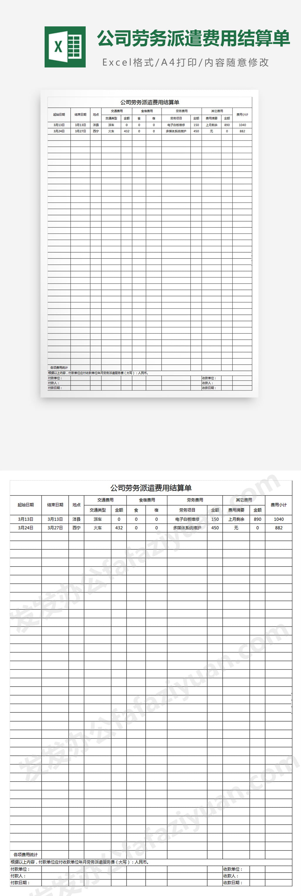 作品内容为公司劳务派遣费用结算单, 格式为 xlsx, 大小1MB,下载后可直接使用, 请使用软件Excel打开, 作品中主体文字及图片可替换修改,文字修改可直接点击文本框进行编辑,图片更改可选中图片后单击鼠标右键选择更换图片,也可根据自身需求增加和删除作品中的内容, 源文件无水印, 欢迎使用发发资源库。