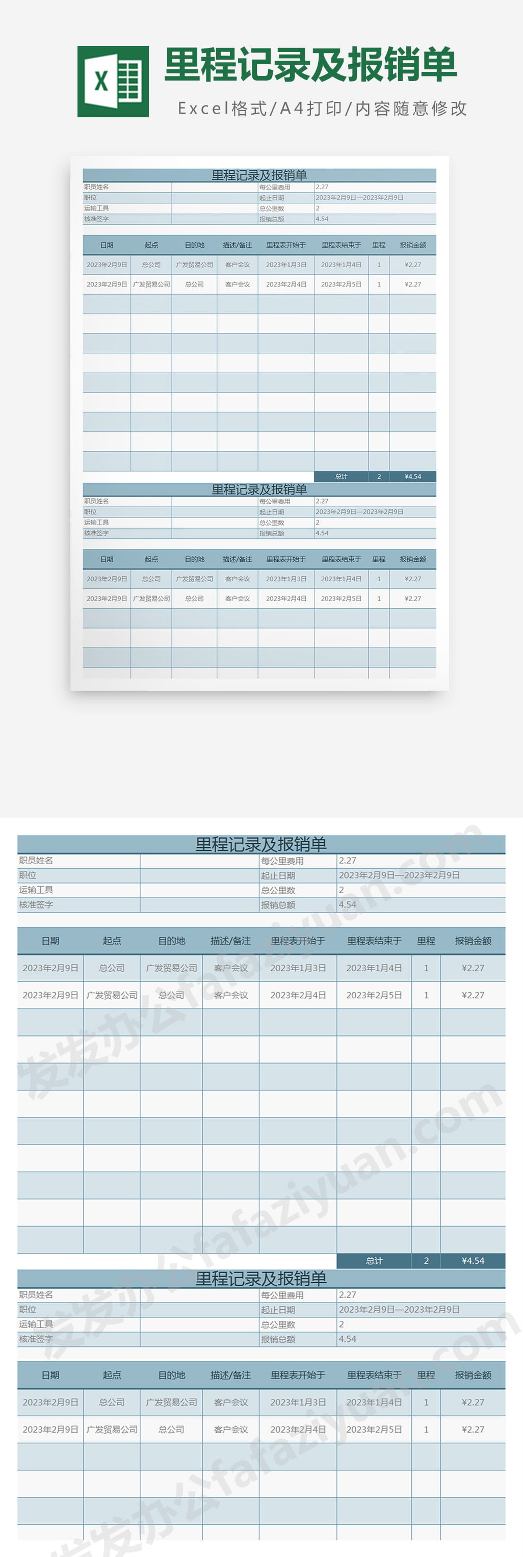 作品内容为里程记录及报销单, 格式为 xlsx, 大小1MB,下载后可直接使用, 请使用软件Excel打开, 作品中主体文字及图片可替换修改,文字修改可直接点击文本框进行编辑,图片更改可选中图片后单击鼠标右键选择更换图片,也可根据自身需求增加和删除作品中的内容, 源文件无水印, 欢迎使用发发资源库。