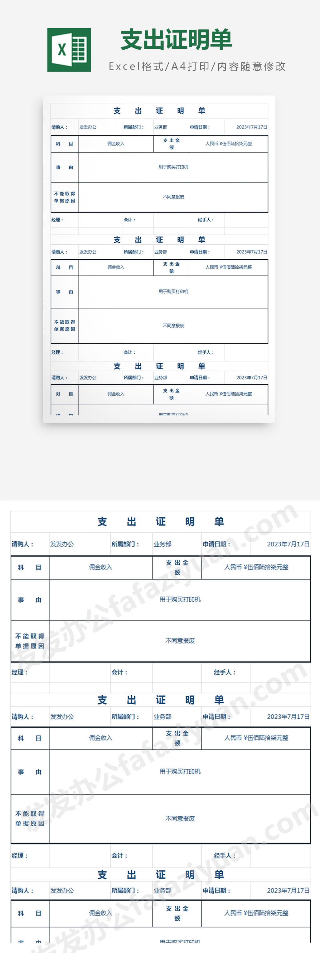 作品内容为支出证明单Excel模板, 格式为 xlsx, 大小1MB,下载后可直接使用, 请使用软件Excel打开, 作品中主体文字及图片可替换修改,文字修改可直接点击文本框进行编辑,图片更改可选中图片后单击鼠标右键选择更换图片,也可根据自身需求增加和删除作品中的内容, 源文件无水印, 欢迎使用发发资源库。