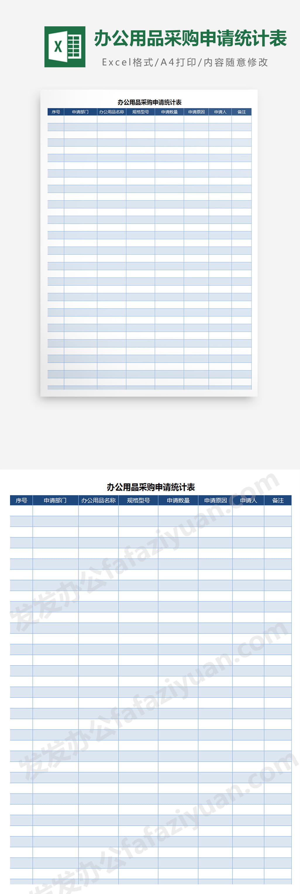 作品内容为办公用品采购申请统计表, 格式为 xlsx, 大小1MB,下载后可直接使用, 请使用软件Excel打开, 作品中主体文字及图片可替换修改,文字修改可直接点击文本框进行编辑,图片更改可选中图片后单击鼠标右键选择更换图片,也可根据自身需求增加和删除作品中的内容, 源文件无水印, 欢迎使用发发资源库。