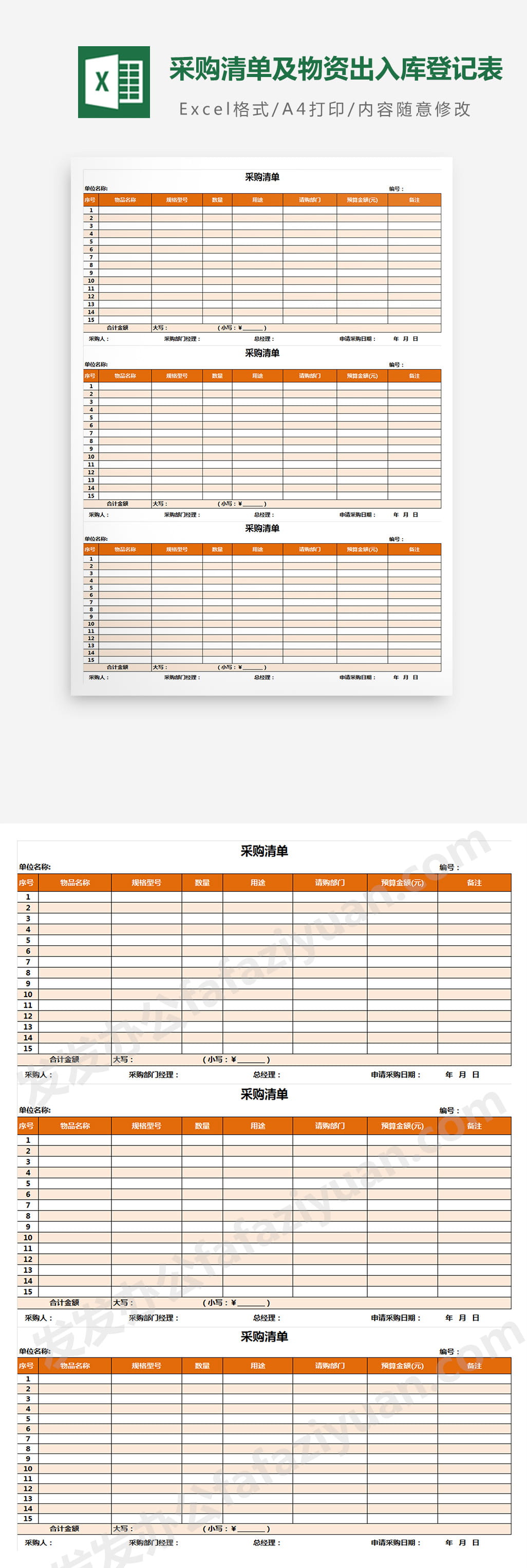 作品内容为采购清单及物资出入库登记表, 格式为 xlsx, 大小1MB,下载后可直接使用, 请使用软件Excel打开, 作品中主体文字及图片可替换修改,文字修改可直接点击文本框进行编辑,图片更改可选中图片后单击鼠标右键选择更换图片,也可根据自身需求增加和删除作品中的内容, 源文件无水印, 欢迎使用发发资源库。