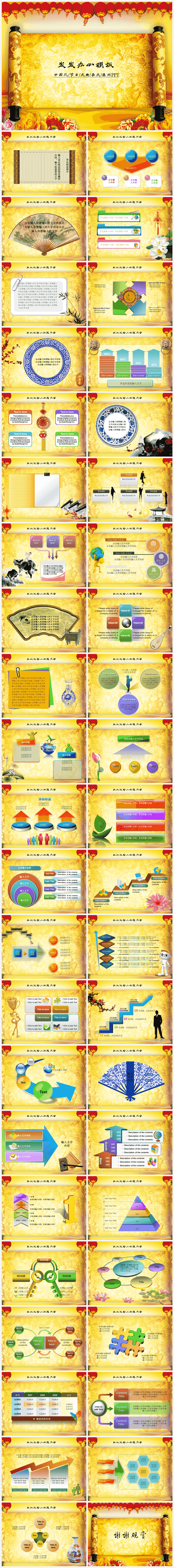 本作品内容为黄色中国风中国元素节日庆典喜庆通用PPT模板。 格式为 ppt, 大小21.3MB, 页数为45,比例4:3, 请使用软件PowerPoint打开, 作品中主体文字及图片可替换修改,文字修改可直接点击文本框进行编辑,图片更改可选中图片后单击鼠标右键选择更换图片,也可根据自身需求增加和删除作品中的内容, 源文件无水印, 欢迎使用发发资源库。