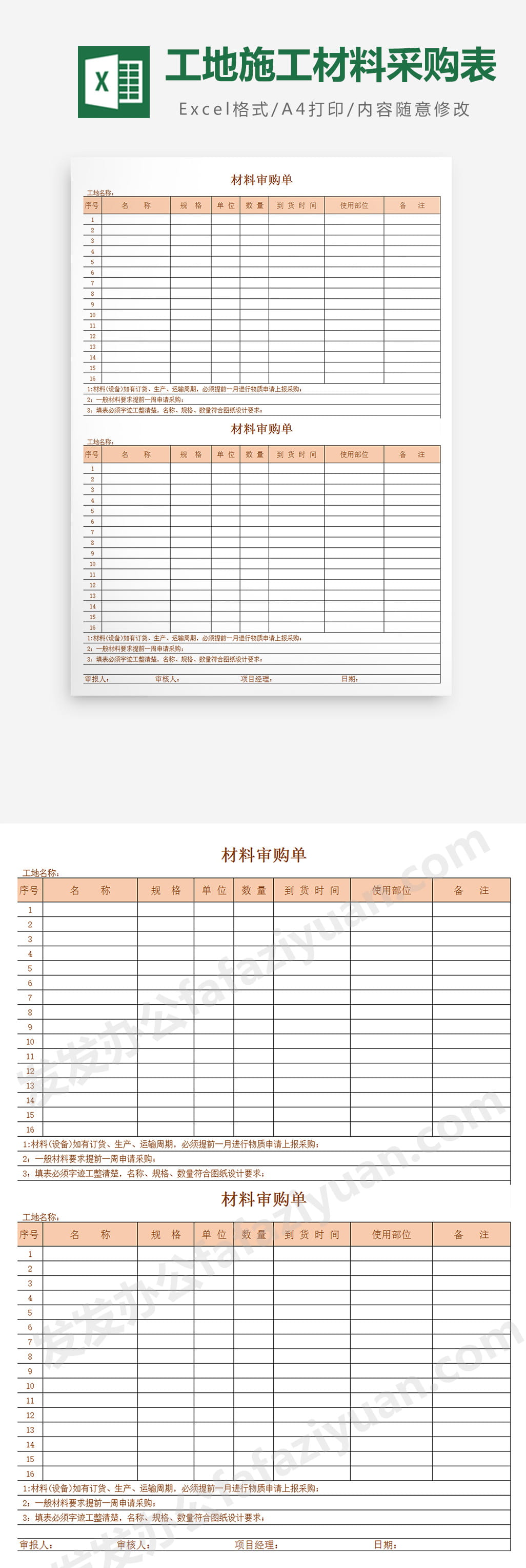 作品内容为工地施工材料采购表, 格式为 xlsx, 大小1MB,下载后可直接使用, 请使用软件Excel打开, 作品中主体文字及图片可替换修改,文字修改可直接点击文本框进行编辑,图片更改可选中图片后单击鼠标右键选择更换图片,也可根据自身需求增加和删除作品中的内容, 源文件无水印, 欢迎使用发发资源库。