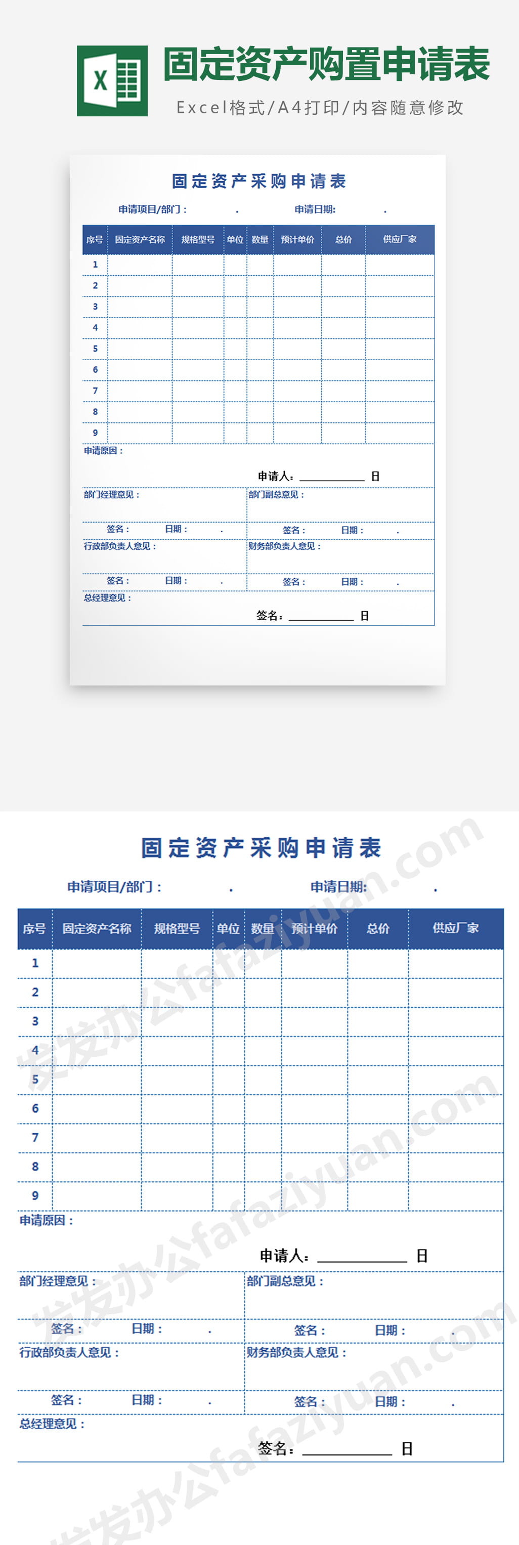 作品内容为固定资产购置申请表, 格式为 xlsx, 大小1MB,下载后可直接使用, 请使用软件Excel打开, 作品中主体文字及图片可替换修改,文字修改可直接点击文本框进行编辑,图片更改可选中图片后单击鼠标右键选择更换图片,也可根据自身需求增加和删除作品中的内容, 源文件无水印, 欢迎使用发发资源库。