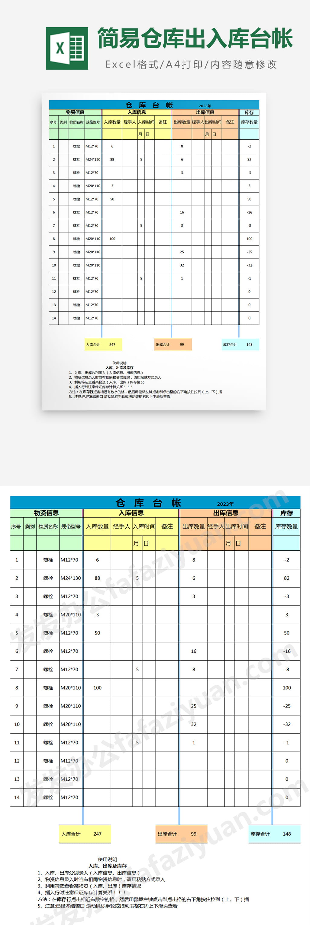 作品内容为简易仓库出入库台帐, 格式为 xlsx, 大小1MB,下载后可直接使用, 请使用软件Excel打开, 作品中主体文字及图片可替换修改,文字修改可直接点击文本框进行编辑,图片更改可选中图片后单击鼠标右键选择更换图片,也可根据自身需求增加和删除作品中的内容, 源文件无水印, 欢迎使用发发资源库。