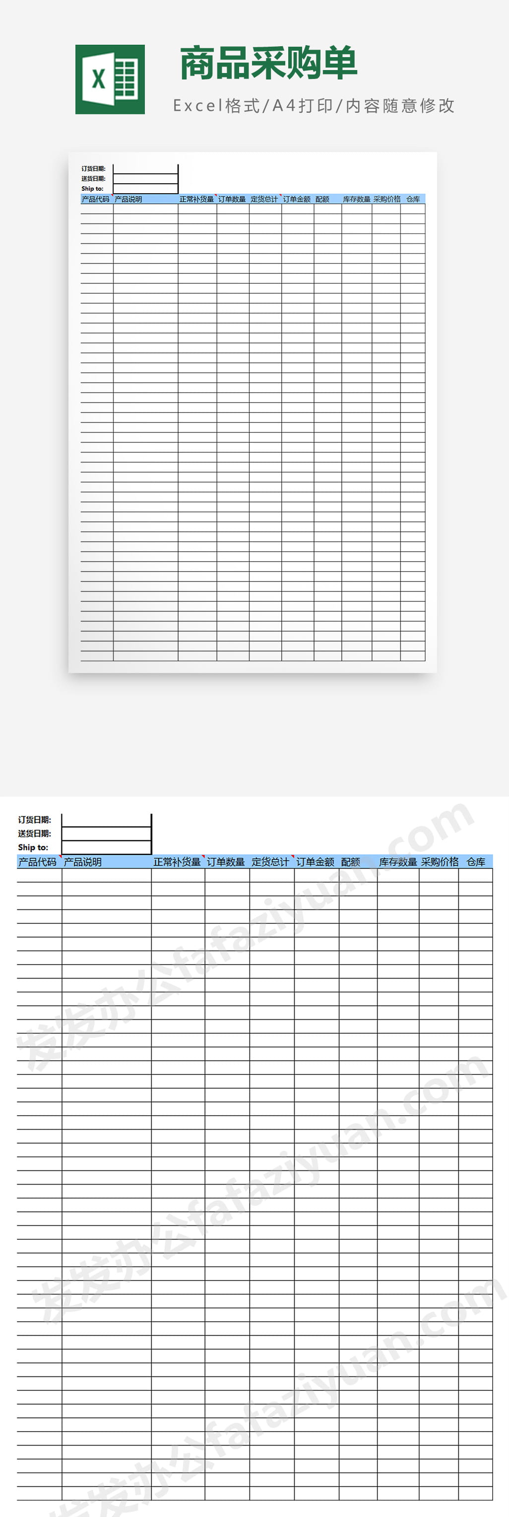 作品内容为商品采购单, 格式为 xlsx, 大小1MB,下载后可直接使用, 请使用软件Excel打开, 作品中主体文字及图片可替换修改,文字修改可直接点击文本框进行编辑,图片更改可选中图片后单击鼠标右键选择更换图片,也可根据自身需求增加和删除作品中的内容, 源文件无水印, 欢迎使用发发资源库。 资源下载此资源下载价格为8.8F币,VIP免费,请先登录
