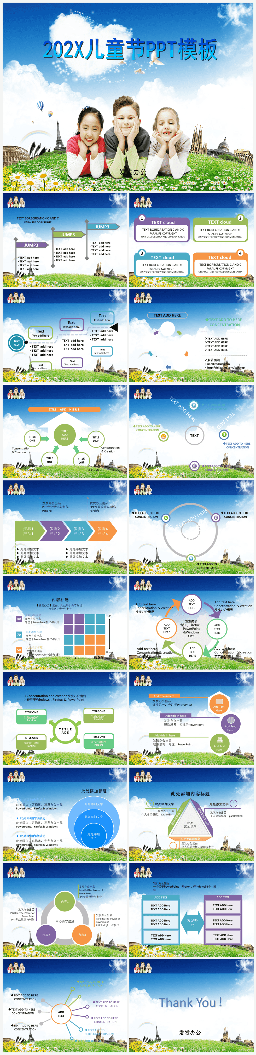 本作品内容为蓝色小清新六一儿童节节日庆典通用PPT模板。 格式为 ppt, 大小4.24MB, 页数为19,比例4:3, 请使用软件PowerPoint打开, 作品中主体文字及图片可替换修改,文字修改可直接点击文本框进行编辑,图片更改可选中图片后单击鼠标右键选择更换图片,也可根据自身需求增加和删除作品中的内容, 源文件无水印, 欢迎使用发发资源库。