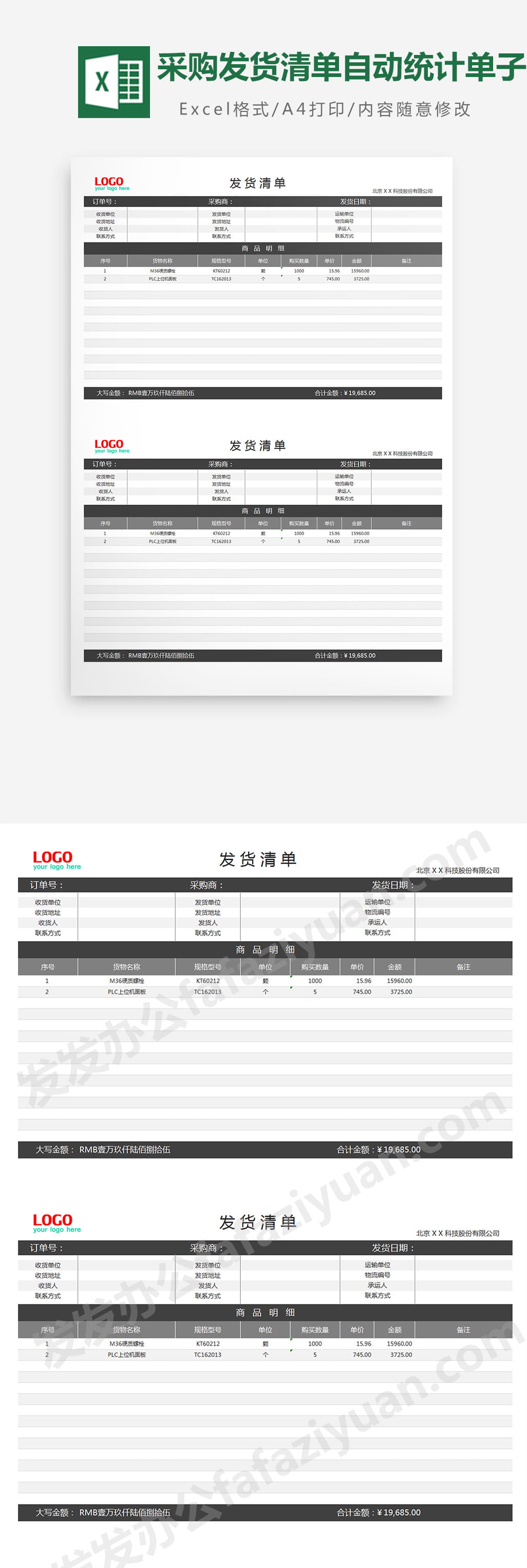 作品内容为采购发货清单自动统计单子, 格式为 xlsx, 大小1MB,下载后可直接使用, 请使用软件Excel打开, 作品中主体文字及图片可替换修改,文字修改可直接点击文本框进行编辑,图片更改可选中图片后单击鼠标右键选择更换图片,也可根据自身需求增加和删除作品中的内容, 源文件无水印, 欢迎使用发发资源库。