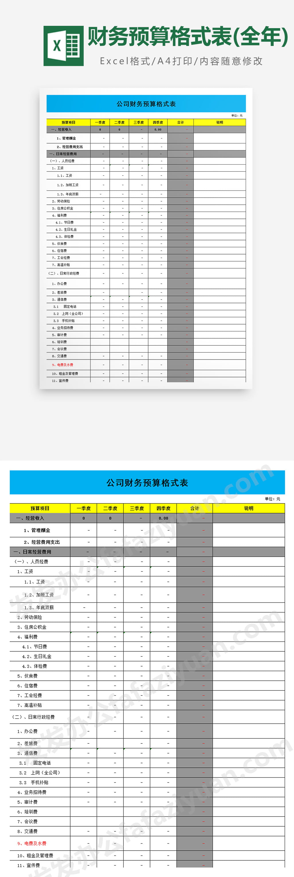 作品内容为财务预算格式表(全年), 格式为 xlsx, 大小1MB,下载后可直接使用, 请使用软件Excel打开, 作品中主体文字及图片可替换修改,文字修改可直接点击文本框进行编辑,图片更改可选中图片后单击鼠标右键选择更换图片,也可根据自身需求增加和删除作品中的内容, 源文件无水印, 欢迎使用发发资源库。