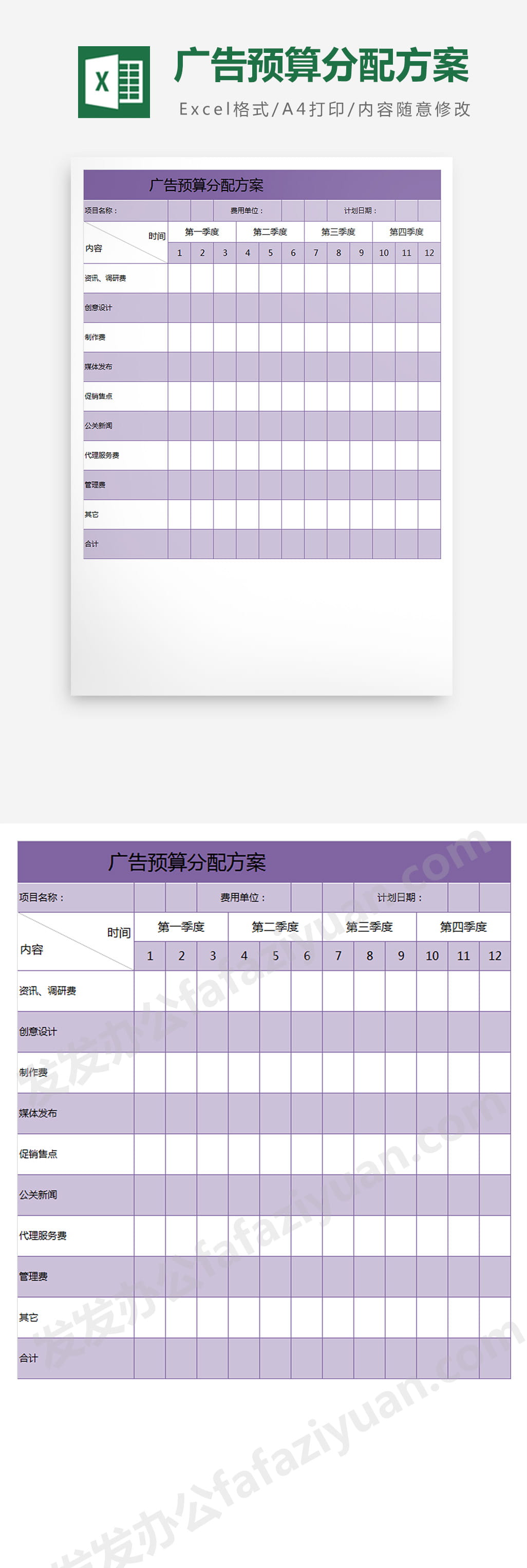 作品内容为广告预算分配方案, 格式为 xlsx, 大小1MB,下载后可直接使用, 请使用软件Excel打开, 作品中主体文字及图片可替换修改,文字修改可直接点击文本框进行编辑,图片更改可选中图片后单击鼠标右键选择更换图片,也可根据自身需求增加和删除作品中的内容, 源文件无水印, 欢迎使用发发资源库。