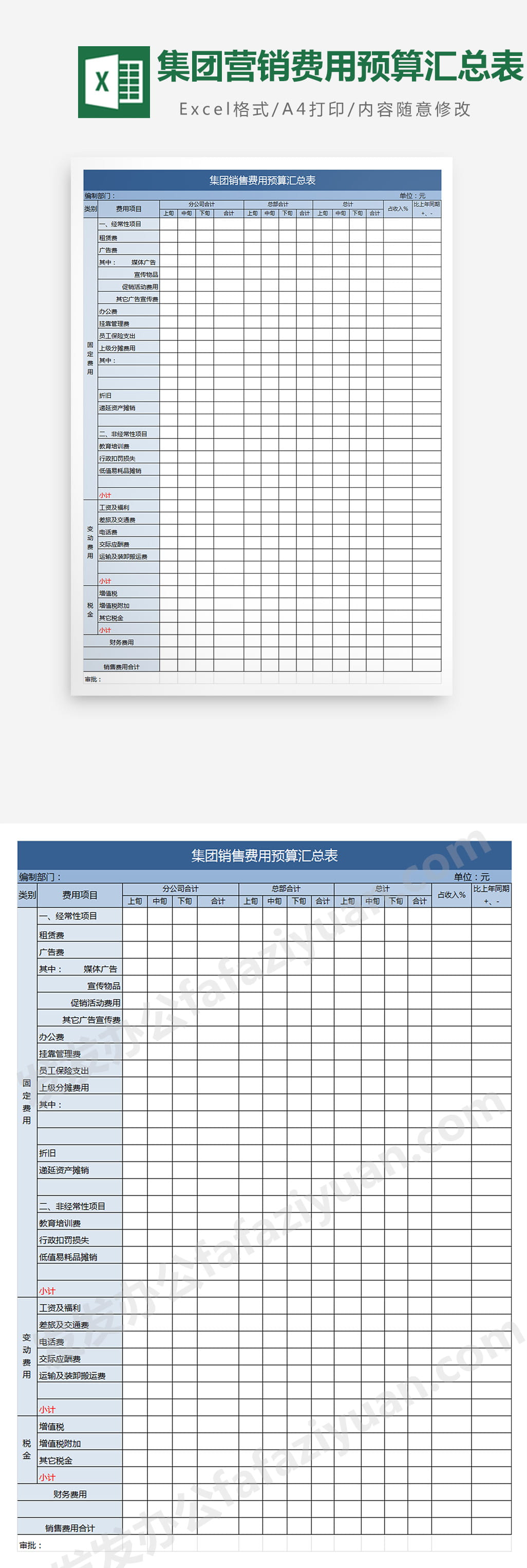作品内容为集团营销费用预算汇总表, 格式为 xlsx, 大小1MB,下载后可直接使用, 请使用软件Excel打开, 作品中主体文字及图片可替换修改,文字修改可直接点击文本框进行编辑,图片更改可选中图片后单击鼠标右键选择更换图片,也可根据自身需求增加和删除作品中的内容, 源文件无水印, 欢迎使用发发资源库。