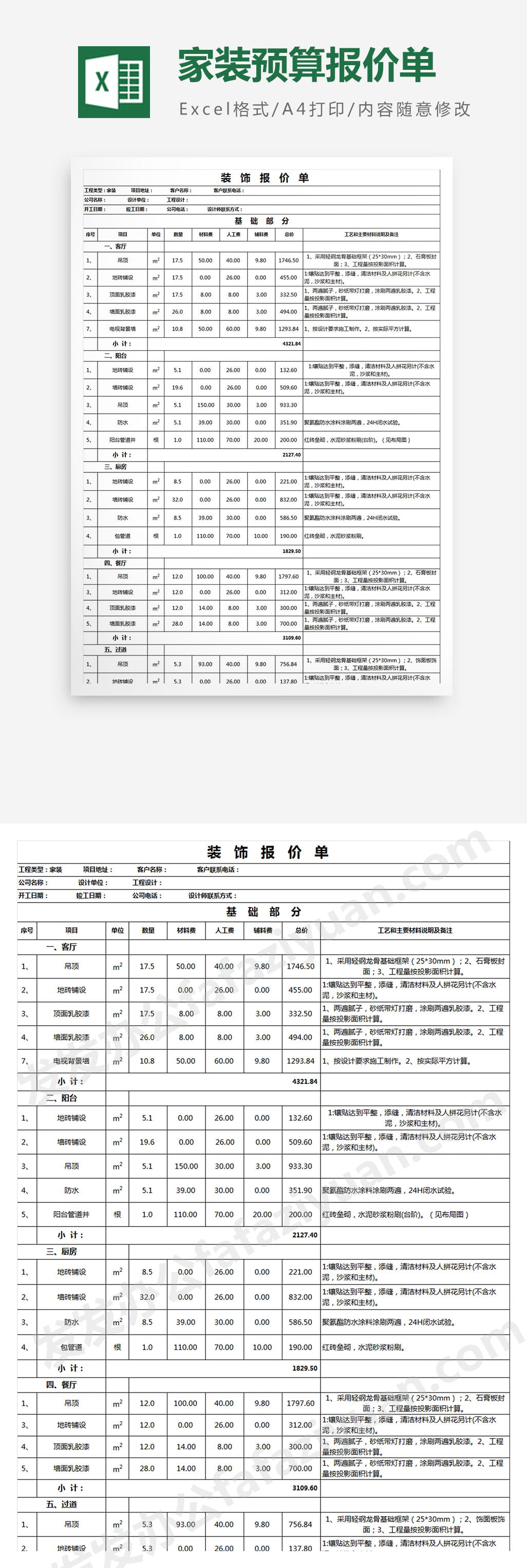 作品内容为家装预算报价单, 格式为 xlsx, 大小1MB,下载后可直接使用, 请使用软件Excel打开, 作品中主体文字及图片可替换修改,文字修改可直接点击文本框进行编辑,图片更改可选中图片后单击鼠标右键选择更换图片,也可根据自身需求增加和删除作品中的内容, 源文件无水印, 欢迎使用发发资源库。