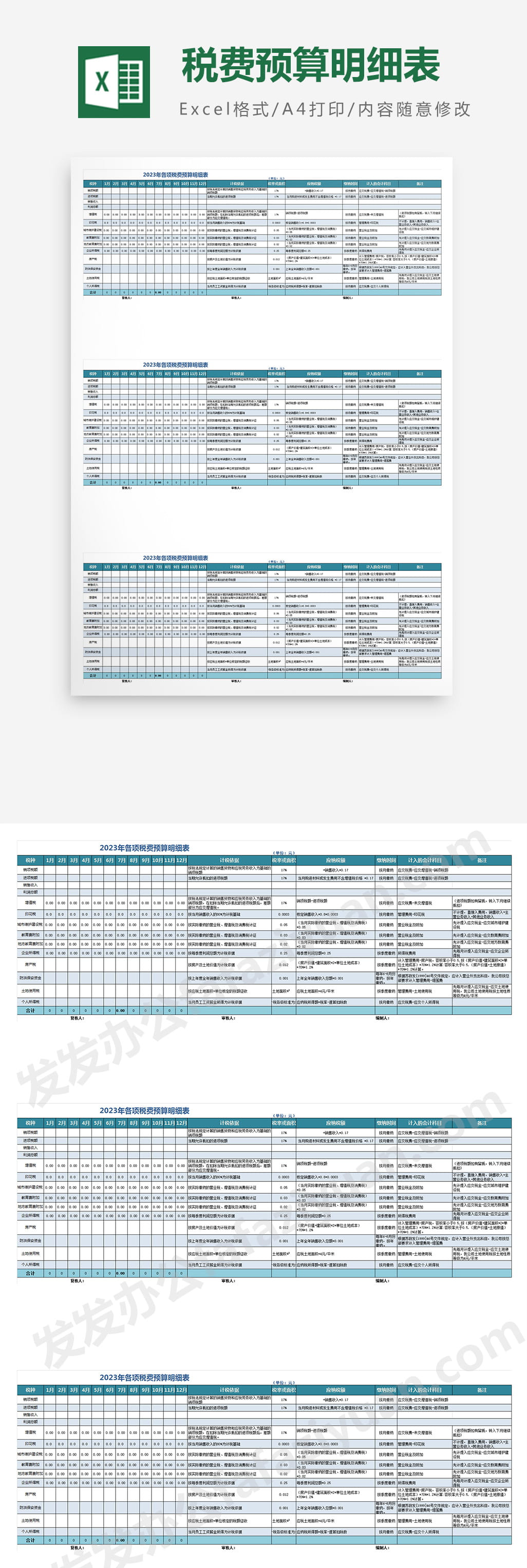 作品内容为税费预算明细表, 格式为 xlsx, 大小1MB,下载后可直接使用, 请使用软件Excel打开, 作品中主体文字及图片可替换修改,文字修改可直接点击文本框进行编辑,图片更改可选中图片后单击鼠标右键选择更换图片,也可根据自身需求增加和删除作品中的内容, 源文件无水印, 欢迎使用发发资源库。