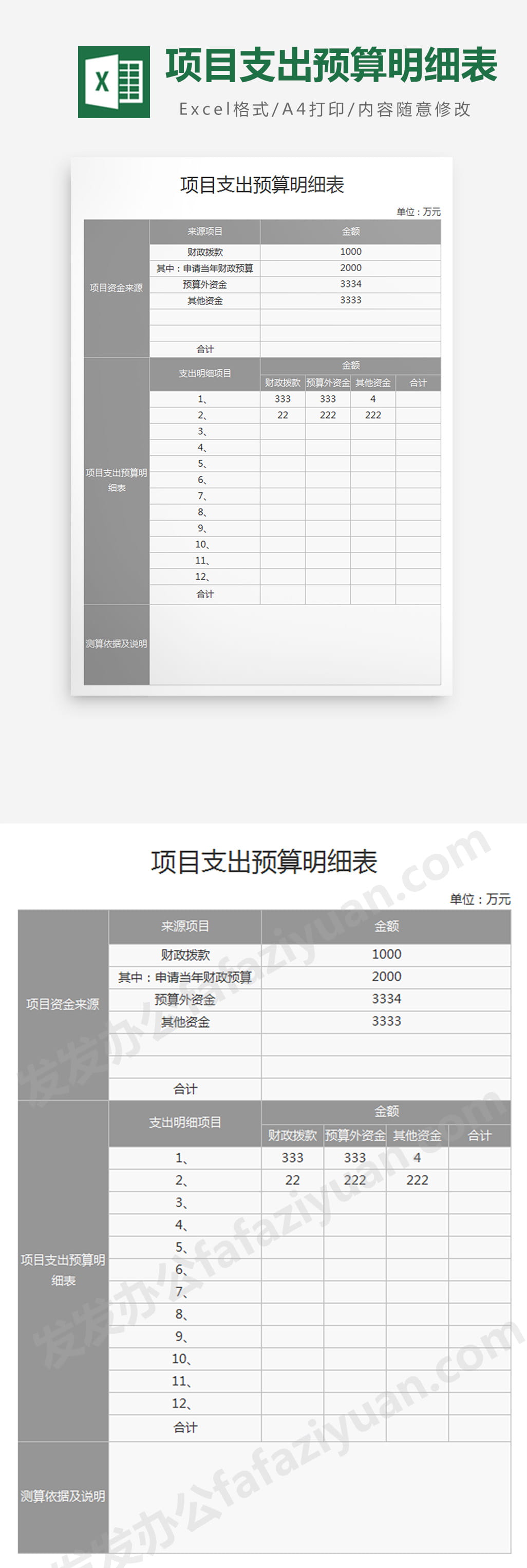 作品内容为项目支出预算明细表, 格式为 xlsx, 大小1MB,下载后可直接使用, 请使用软件Excel打开, 作品中主体文字及图片可替换修改,文字修改可直接点击文本框进行编辑,图片更改可选中图片后单击鼠标右键选择更换图片,也可根据自身需求增加和删除作品中的内容, 源文件无水印, 欢迎使用发发资源库。
