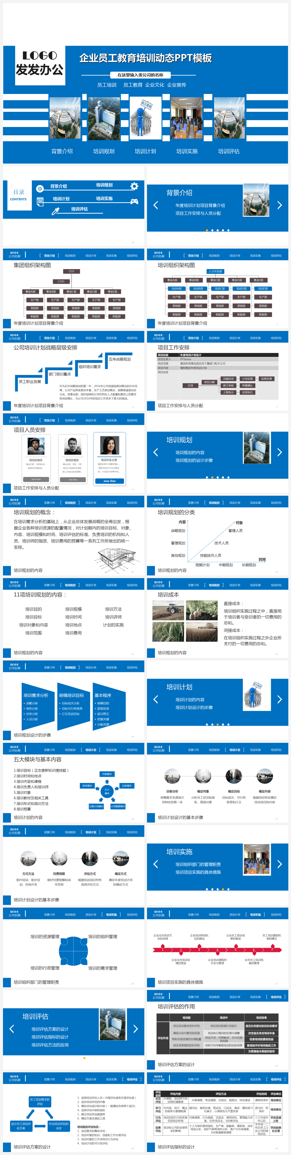 本作品内容为蓝色简约风企业员工教育培训入职培训动态PPT通用模板, 格式为 pptx, 大小10.9MB, 页数为25,比例自定义, 请使用软件PowerPoint打开, 作品中主体文字及图片可替换修改,文字修改可直接点击文本框进行编辑,图片更改可选中图片后单击鼠标右键选择更换图片,也可根据自身需求增加和删除作品中的内容, 源文件无水印, 欢迎使用发发资源库。