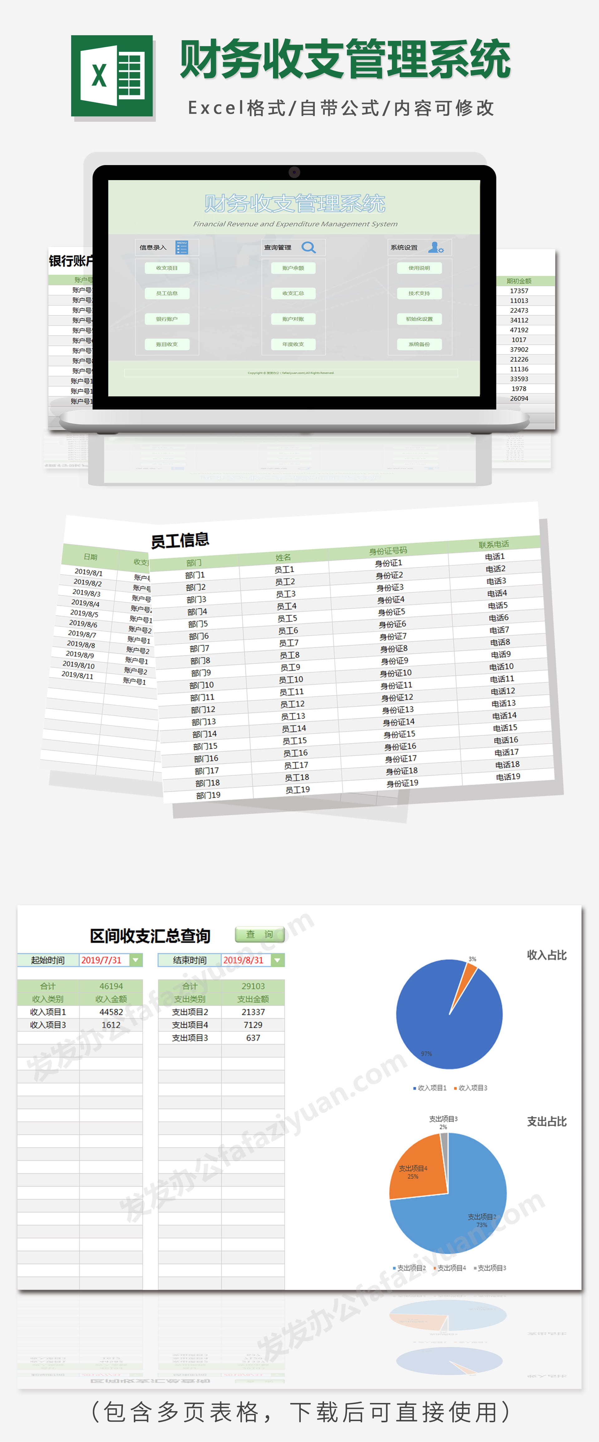 作品内容为财务收支管理系统Excel表格, 格式为 xlsx, 大小1MB,下载后可直接使用, 请使用软件Excel打开, 作品中主体文字及图片可替换修改,文字修改可直接点击文本框进行编辑,图片更改可选中图片后单击鼠标右键选择更换图片,也可根据自身需求增加和删除作品中的内容, 源文件无水印, 欢迎使用发发资源库。