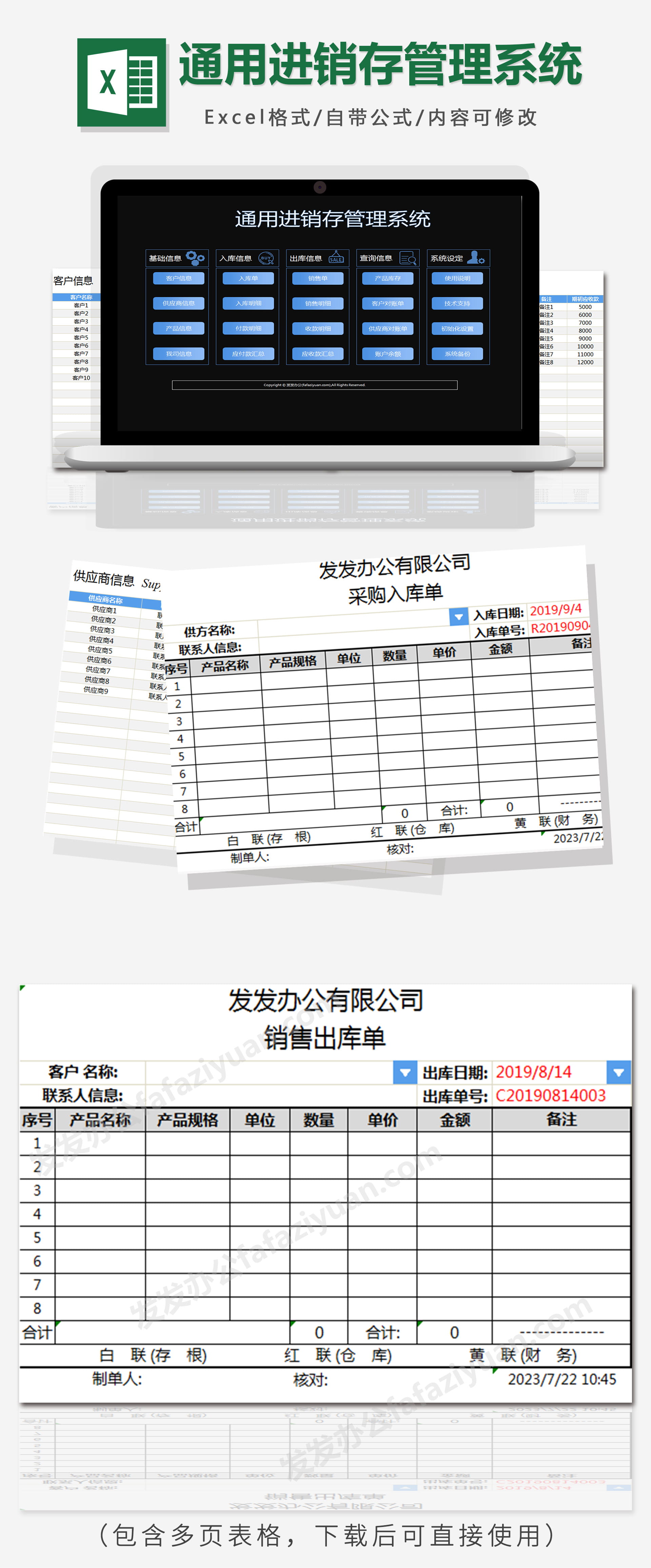 作品内容为通用进销存管理系统, 格式为 xlsx, 大小1MB,下载后可直接使用, 请使用软件Excel打开, 作品中主体文字及图片可替换修改,文字修改可直接点击文本框进行编辑,图片更改可选中图片后单击鼠标右键选择更换图片,也可根据自身需求增加和删除作品中的内容, 源文件无水印, 欢迎使用发发资源库。