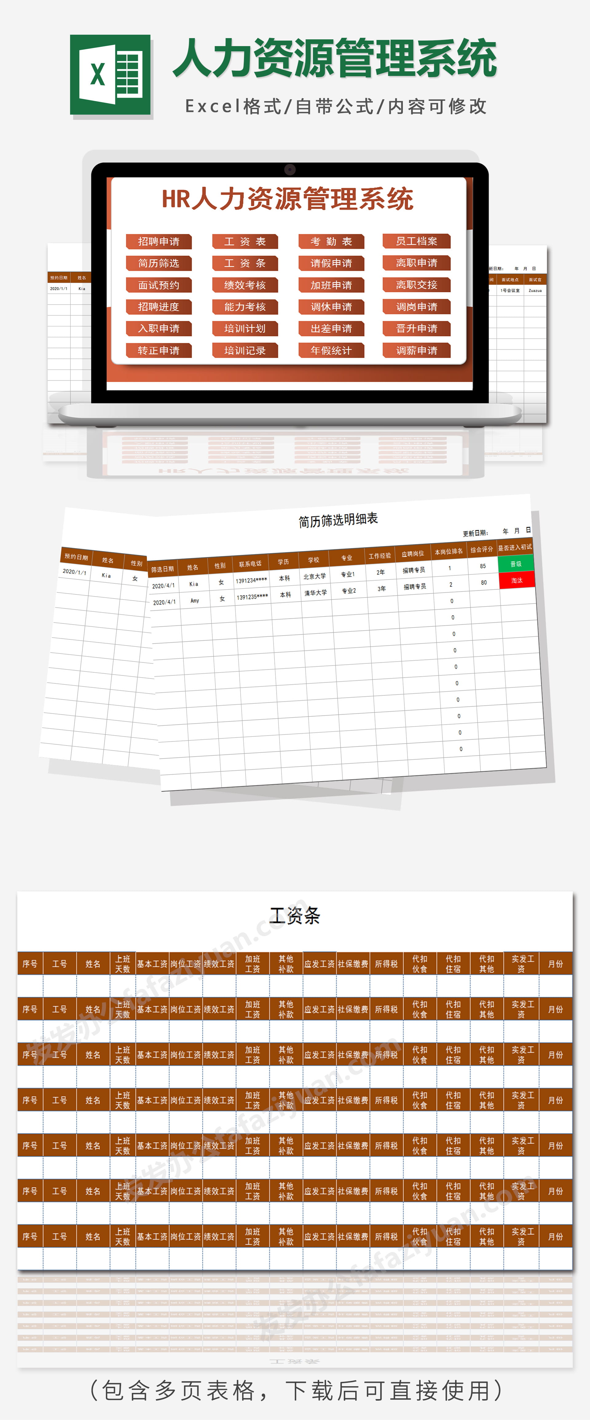 作品内容为人力资源管理系统, 格式为 xlsx, 大小1MB,下载后可直接使用, 请使用软件Excel打开, 作品中主体文字及图片可替换修改,文字修改可直接点击文本框进行编辑,图片更改可选中图片后单击鼠标右键选择更换图片,也可根据自身需求增加和删除作品中的内容, 源文件无水印, 欢迎使用发发资源库。