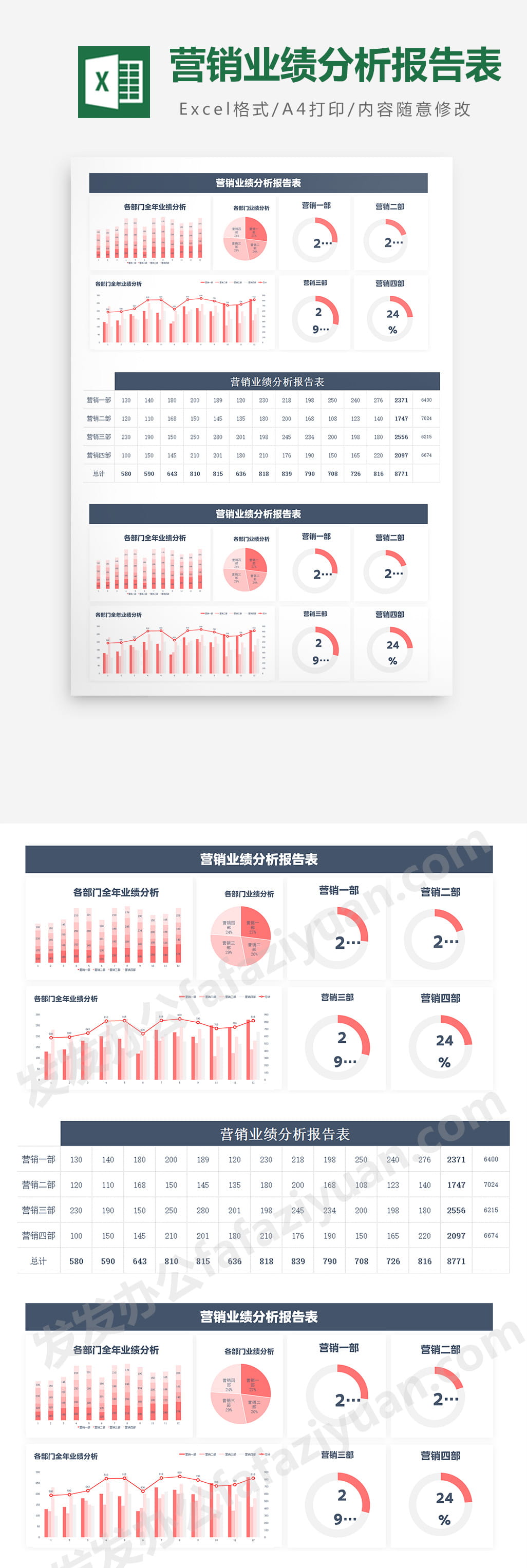 作品内容为营销业绩分析报告表, 格式为 xlsx, 大小1MB,下载后可直接使用, 请使用软件Excel打开, 作品中主体文字及图片可替换修改,文字修改可直接点击文本框进行编辑,图片更改可选中图片后单击鼠标右键选择更换图片,也可根据自身需求增加和删除作品中的内容, 源文件无水印, 欢迎使用发发资源库。 资源下载此资源下载价格为8.8F币,VIP免费,请先登录