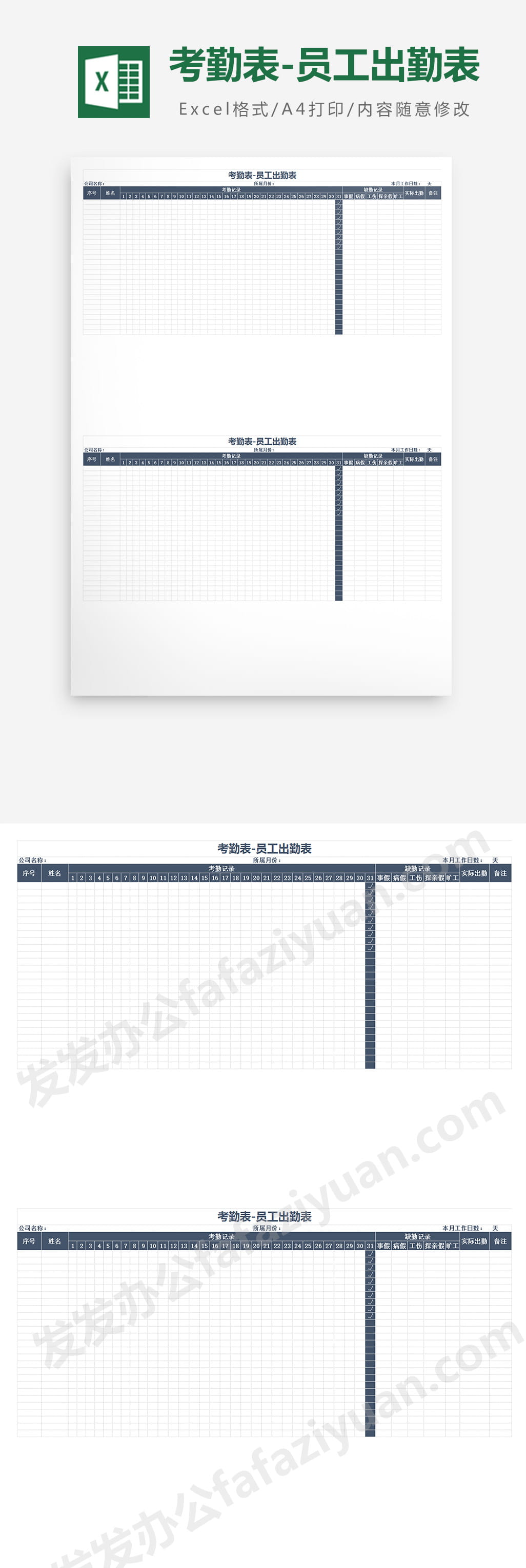 作品内容为考勤表-员工出勤表, 格式为 xlsx, 大小1MB,下载后可直接使用, 请使用软件Excel打开, 作品中主体文字及图片可替换修改,文字修改可直接点击文本框进行编辑,图片更改可选中图片后单击鼠标右键选择更换图片,也可根据自身需求增加和删除作品中的内容, 源文件无水印, 欢迎使用发发资源库。