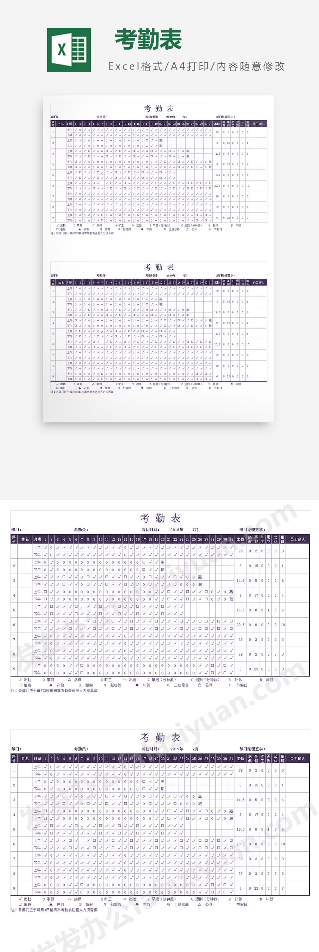 作品内容为考勤表Excel表格, 格式为 xlsx, 大小1MB,下载后可直接使用, 请使用软件Excel打开, 作品中主体文字及图片可替换修改,文字修改可直接点击文本框进行编辑,图片更改可选中图片后单击鼠标右键选择更换图片,也可根据自身需求增加和删除作品中的内容, 源文件无水印, 欢迎使用发发资源库。