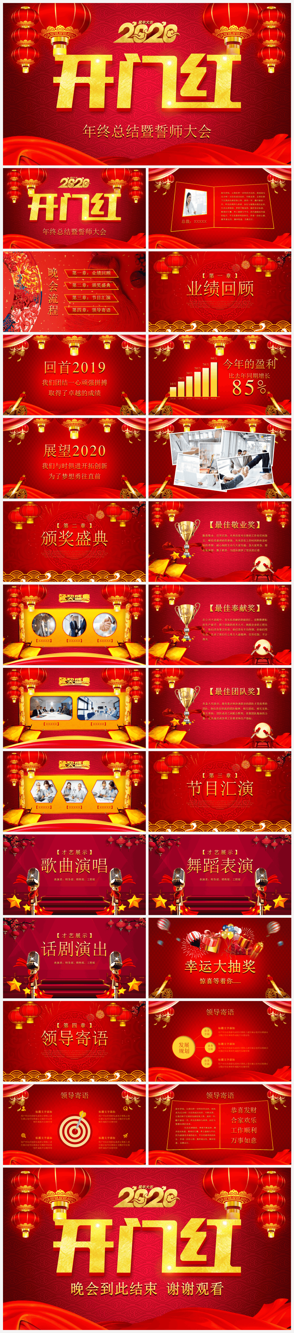 本作品内容为红色中国风年终总结暨誓师大会颁奖晚会通用PPT模板, 格式为 pptx, 大小36.2MB, 页数为26,比例自定义, 请使用软件PowerPoint打开, 作品中主体文字及图片可替换修改,文字修改可直接点击文本框进行编辑,图片更改可选中图片后单击鼠标右键选择更换图片,也可根据自身需求增加和删除作品中的内容, 源文件无水印, 欢迎使用发发资源库。