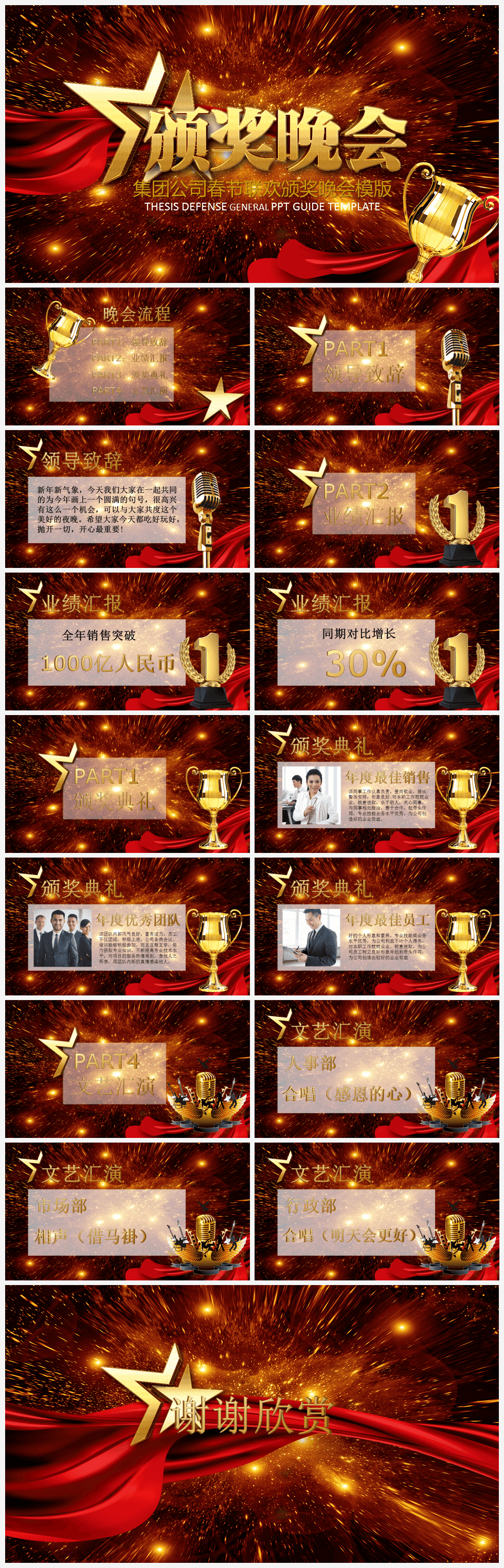 本作品内容为大气公司春节联欢颁奖晚会PPT通用模板, 格式为 pptx, 大小15.4MB, 页数为16,比例自定义, 请使用软件PowerPoint打开, 作品中主体文字及图片可替换修改,文字修改可直接点击文本框进行编辑,图片更改可选中图片后单击鼠标右键选择更换图片,也可根据自身需求增加和删除作品中的内容, 源文件无水印, 欢迎使用发发资源库。