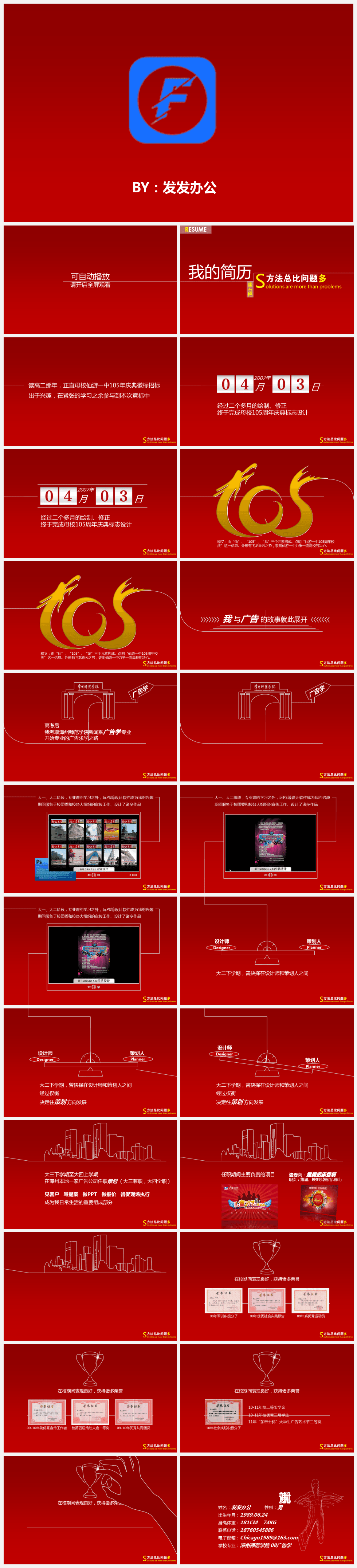 本作品内容为红色简约风酷炫个人简历案例展示求职应聘PPT模板, 格式为 ppt, 大小6.9MB, 页数为25,比例16:10, 请使用软件PowerPoint打开, 作品中主体文字及图片可替换修改,文字修改可直接点击文本框进行编辑,图片更改可选中图片后单击鼠标右键选择更换图片,也可根据自身需求增加和删除作品中的内容, 源文件无水印, 欢迎使用发发资源库。