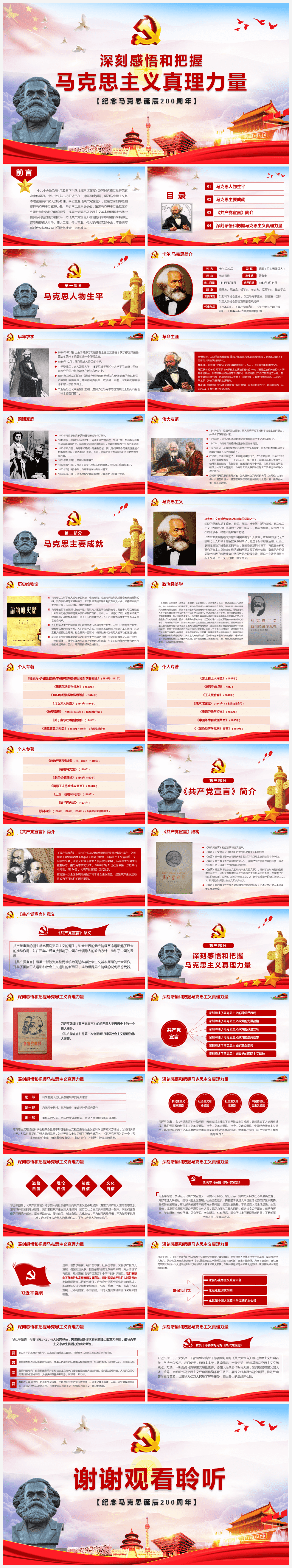 本作品内容为中国风红色感悟和把握马克思主义真理力量纪念马克思诞辰发言稿PPT模板{含内容}, 格式为 pptx, 大小12.6MB, 页数为32,比例自定义, 请使用软件PowerPoint打开, 作品中主体文字及图片可替换修改,文字修改可直接点击文本框进行编辑,图片更改可选中图片后单击鼠标右键选择更换图片,也可根据自身需求增加和删除作品中的内容, 源文件无水印, 欢迎使用发发资源库。