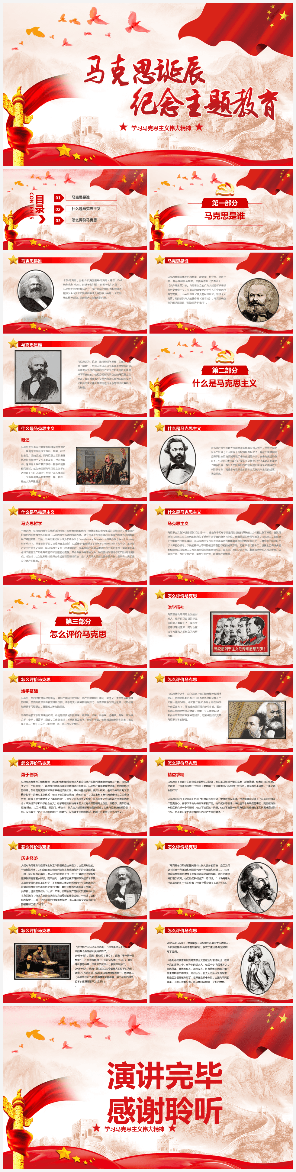 本作品内容为中国风红色马克思诞辰纪念主题教育党政军警PPT模板{含内容}, 格式为 pptx, 大小21.6MB, 页数为22,比例自定义, 请使用软件PowerPoint打开, 作品中主体文字及图片可替换修改,文字修改可直接点击文本框进行编辑,图片更改可选中图片后单击鼠标右键选择更换图片,也可根据自身需求增加和删除作品中的内容, 源文件无水印, 欢迎使用发发资源库。