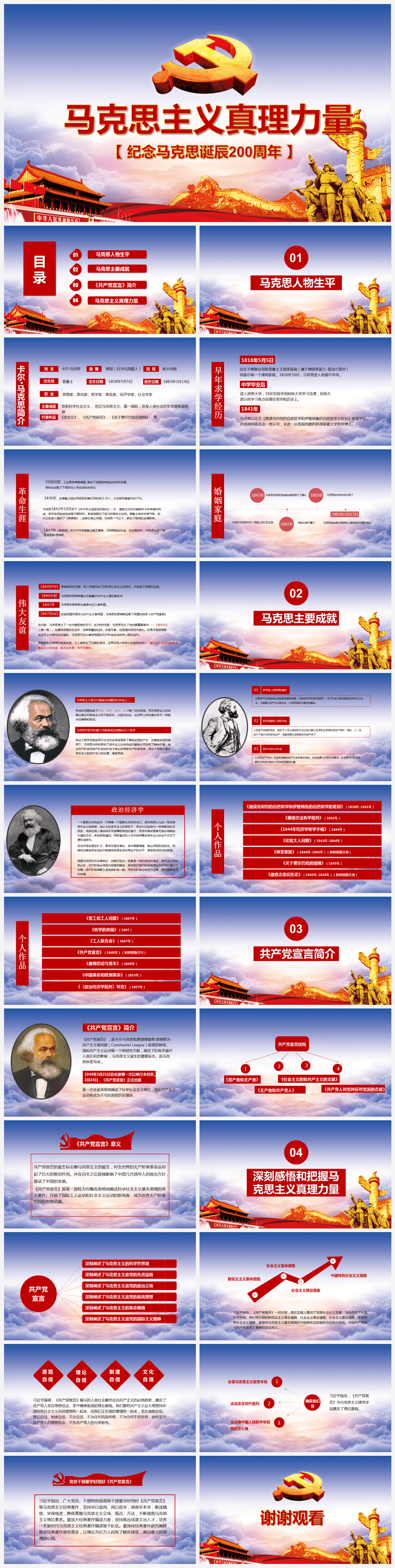 本作品内容为中国红色马克思主义真理力量党政军警PPT通用模板{含内容}, 格式为 pptx, 大小13MB, 页数为25,比例自定义, 请使用软件PowerPoint打开, 作品中主体文字及图片可替换修改,文字修改可直接点击文本框进行编辑,图片更改可选中图片后单击鼠标右键选择更换图片,也可根据自身需求增加和删除作品中的内容, 源文件无水印, 欢迎使用发发资源库。