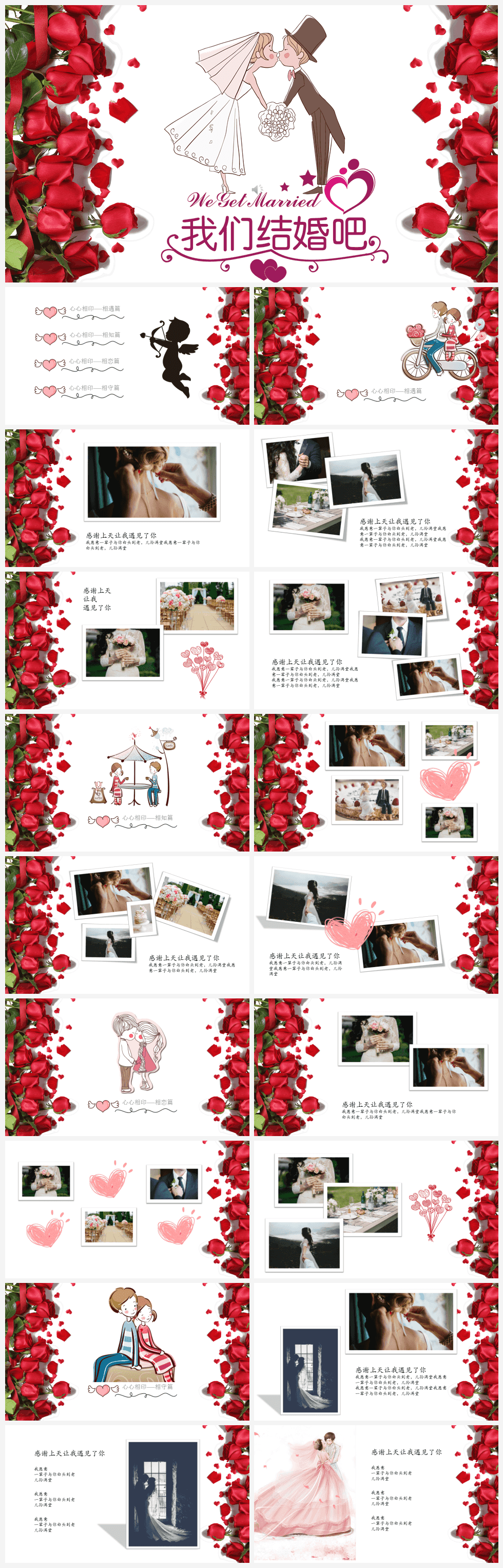 本作品内容为红色玫瑰系浪漫求婚表白我们结婚吧PPT模板, 格式为 pptx, 大小15.2MB, 页数为19,比例自定义, 请使用软件PowerPoint打开, 作品中主体文字及图片可替换修改,文字修改可直接点击文本框进行编辑,图片更改可选中图片后单击鼠标右键选择更换图片,也可根据自身需求增加和删除作品中的内容, 源文件无水印, 欢迎使用发发资源库。