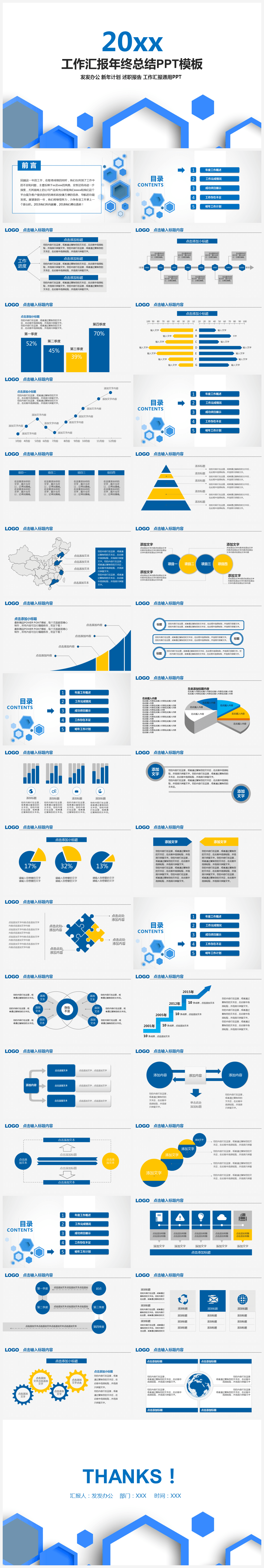 本作品内容为蓝色欧美风工作汇报年终总结PPT通用模板, 格式为 pptx, 大小8.75 MB, 页数为36,比例自定义, 请使用软件PowerPoint打开, 作品中主体文字及图片可替换修改,文字修改可直接点击文本框进行编辑,图片更改可选中图片后单击鼠标右键选择更换图片,也可根据自身需求增加和删除作品中的内容, 源文件无水印, 欢迎使用发发资源库。